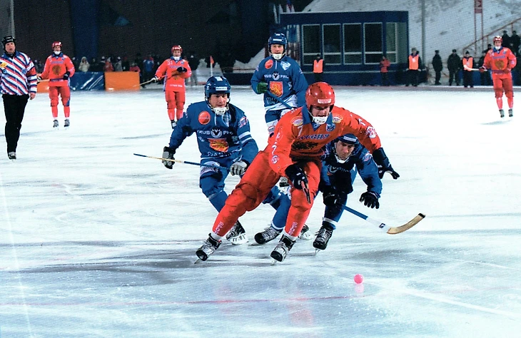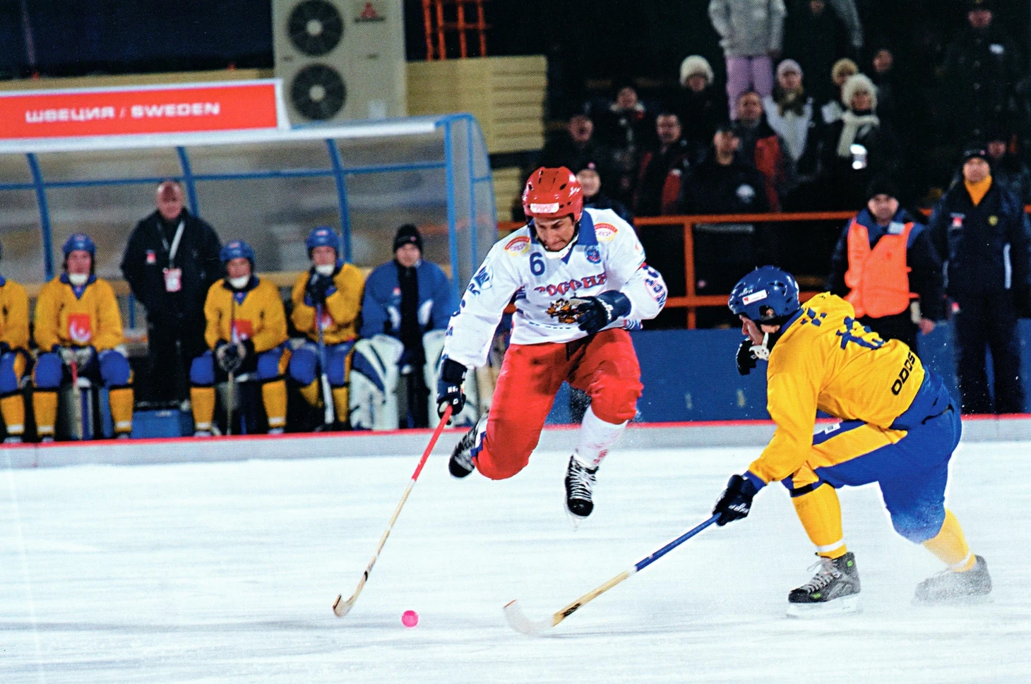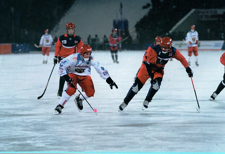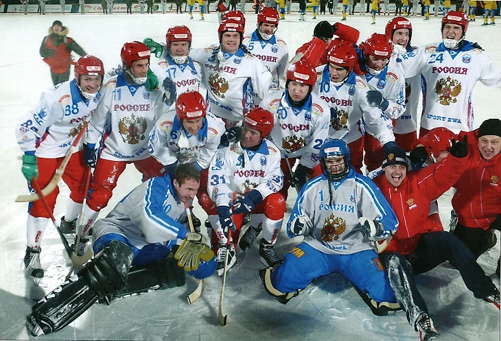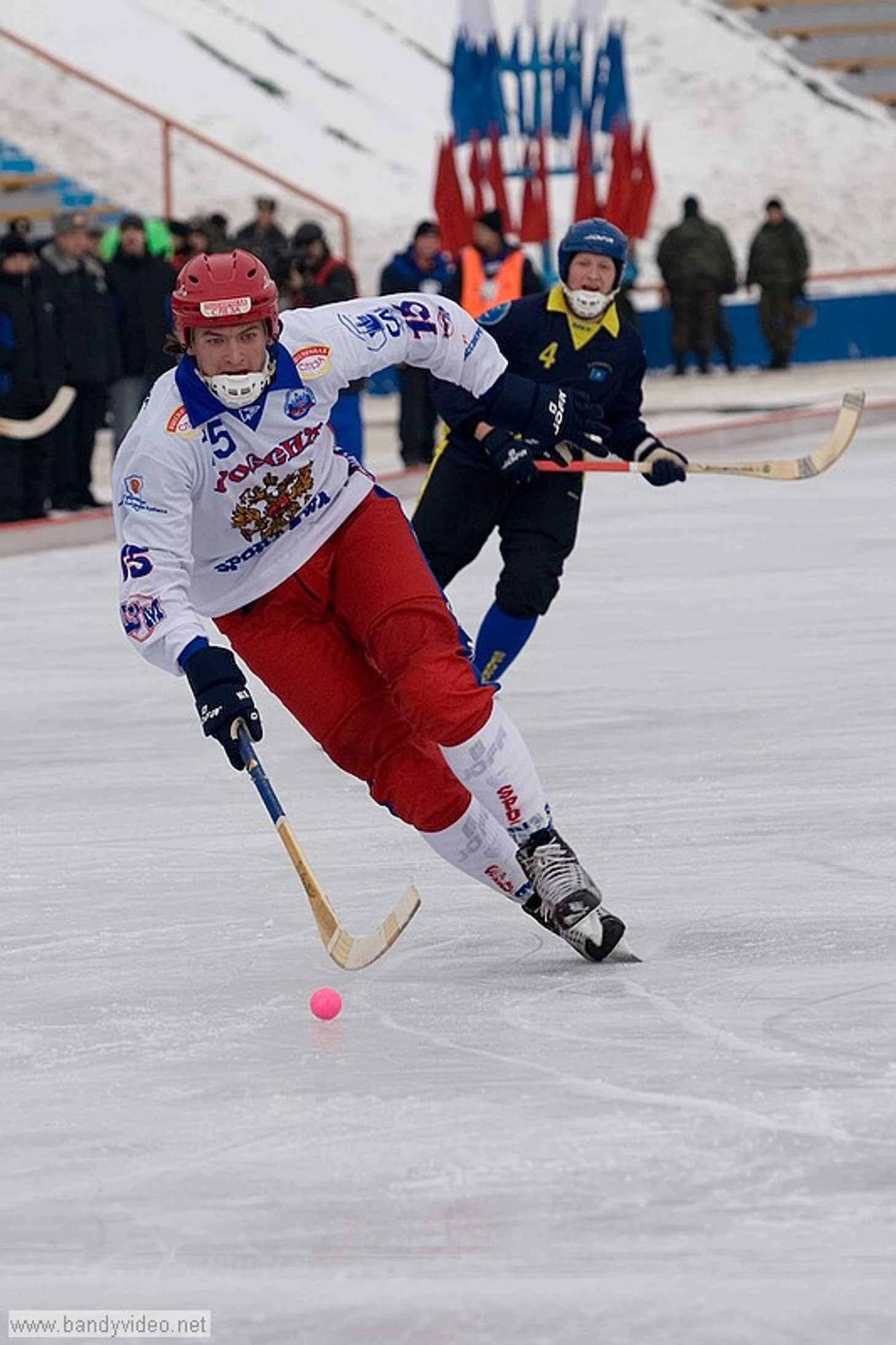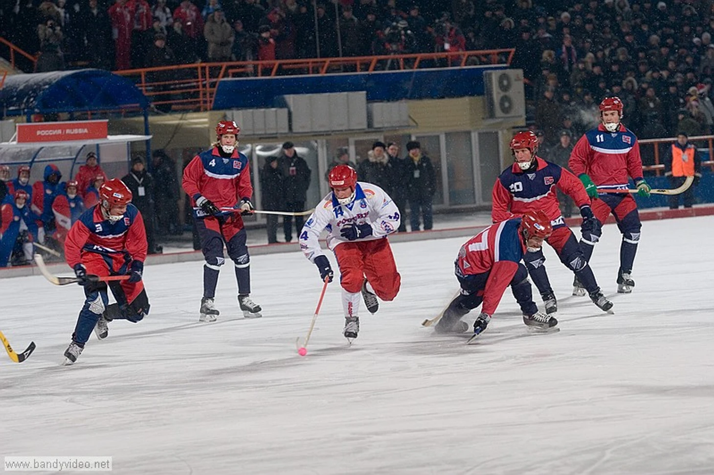 28 января 2007. Кемерово, стадион «Химик». Матч предварительного этапа XXVII чемпионата мира Россия — Норвегия — 18:2. В этой игре Сергей Обухов (с мячом) забил свой сотый мяч за сборную страны