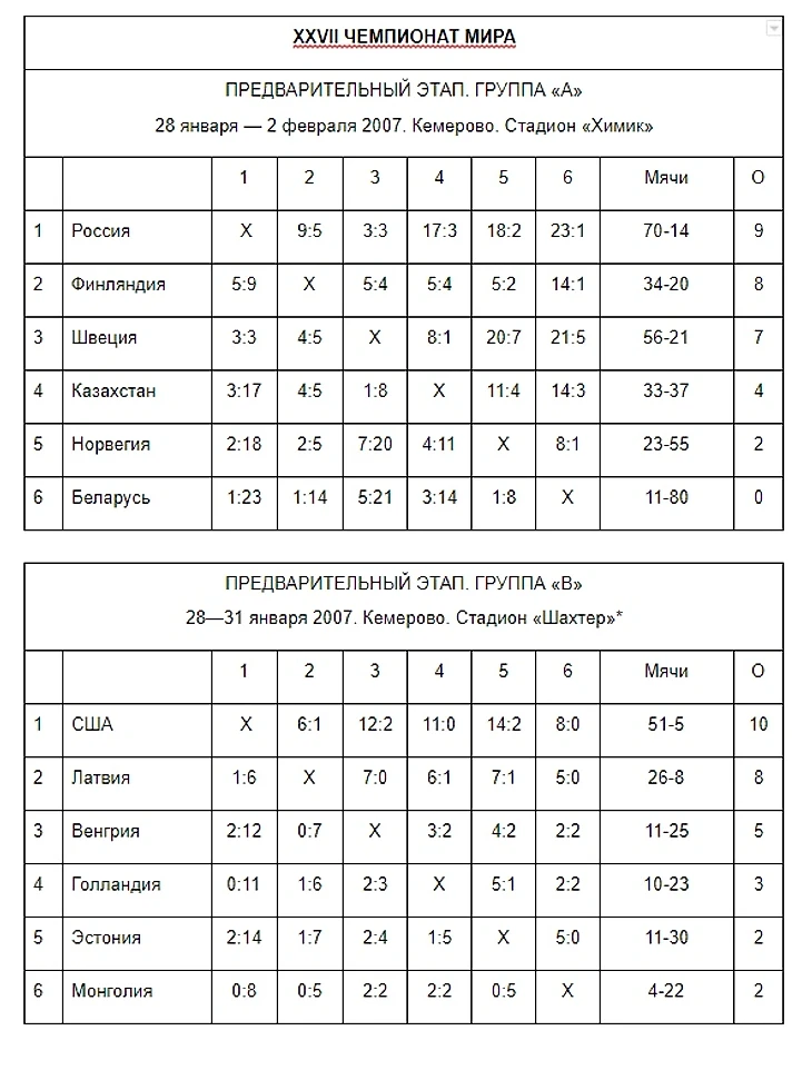 Гвоздем группового этапа стал, разумеется, поединок Россия — Швеция. Тренерскому штабу нашей сборной пришлось решать неожиданно возникшие проблемы: на предматчевой разминке получил травму Александр Тюкавин, и вместо него на лед вышел Павел Рязанцев. Еще раньше в заявку было внесено другое изменение — место травмированного накануне Василия Грановского занял Алексей Чижов. Он-то, к слову, и «отличился» на 26-й минуте, когда за опасную атаку соперника был удален до конца встречи без права замены — почти 65 минут наша команда вынуждена была играть в меньшинстве. Тем не менее встреча проходила в абсолютно равной борьбе: дважды наша сборная выходила вперед — 1:0 и 2:1, и оба раза шведы отыгрывались, а на 51-й минуте и вовсе вышли вперед — 3:2. На 57-й минуте Сергей Обухов восстановил равновесие — 3:3. Этот счет не изменился до финального свистка, и когда обе команды уже отправились было в раздевалки, организаторы вспомнили, что в подобных случаях регламент предписывает пробивать серии послематчевых пенальти. Хоккеисты сборной России реализовали все свои попытки, тогда как шведы только три — 5:3. К слову, казус с послематчевыми пенальти уже случился на чемпионате тремя днями раньше на турнире группы B (он проходил на кемеровском стадионе «Шахтер», впервые в чемпионате мира участвовали 12 команд): сборные Монголии и Голландии также завершили свою встречу вничью — 2:2, но серии пенальти пробивали… на следующий день.