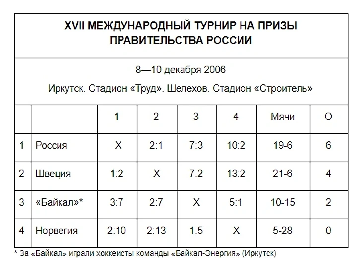 Интриги на турнире, по большому счету, было всего лишь две. Первая: сумеет ли наспех собранная из талантливых, но еще не обстрелянных в больших хоккейных битвах россиян сборная дать бой своим заклятым соперникам — шведам, которые, к слову, привезли в Иркутск боевой состав? Вторая: как выступят на родном льду при сумасшедшей поддержке болельщиков хозяева, возглавлявшие на тот момент турнирную таблицу Востока в чемпионате страны? Если коротко, то резюме по итогам трехдневной борьбы получилось таким: и молодежь из сборной показала себя с лучшей стороны, и парни из «Байкал-Энергии» не ударили в грязь лицом.