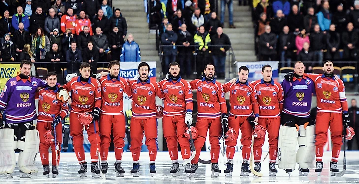 5 февраля 2017. Сандвикен, «Йоранссон-Арена». Сборная России перед началом финального матча XXXVII чемпионата мира со сборной Швеции (слева направо): Денис Рысев, Никита Иванов, Александр Антипов, Артем Бондаренко, Михаил Прокопьев, Василий Грановский, Алексей Чижов, Дмитрий Савельев, Сергей Шабуров, Роман Черных, Алан Джусоев
