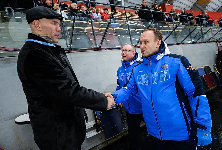 Член исполкома ФХМР, знаменитый боксер Николай Сергеевич Валуев и главный тренер сборной России Сергей Анатольевич Мяус во время XXXVII чемпионата мира в шведском Сандвикене