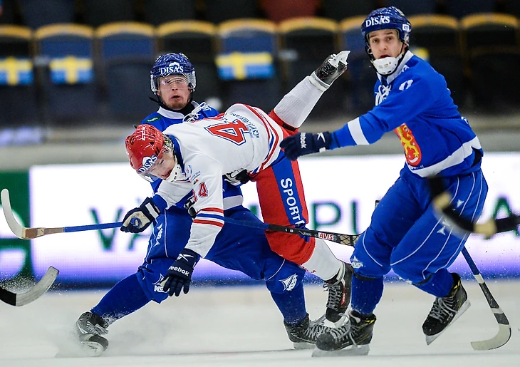 4 февраля 2017. Сандвикен, «Йоранссон-Арена». Полуфинальный матч XXXVII чемпионата мира Россия — Финляндия — 6:4. Финские защитники жестко встречают Никиту Иванова