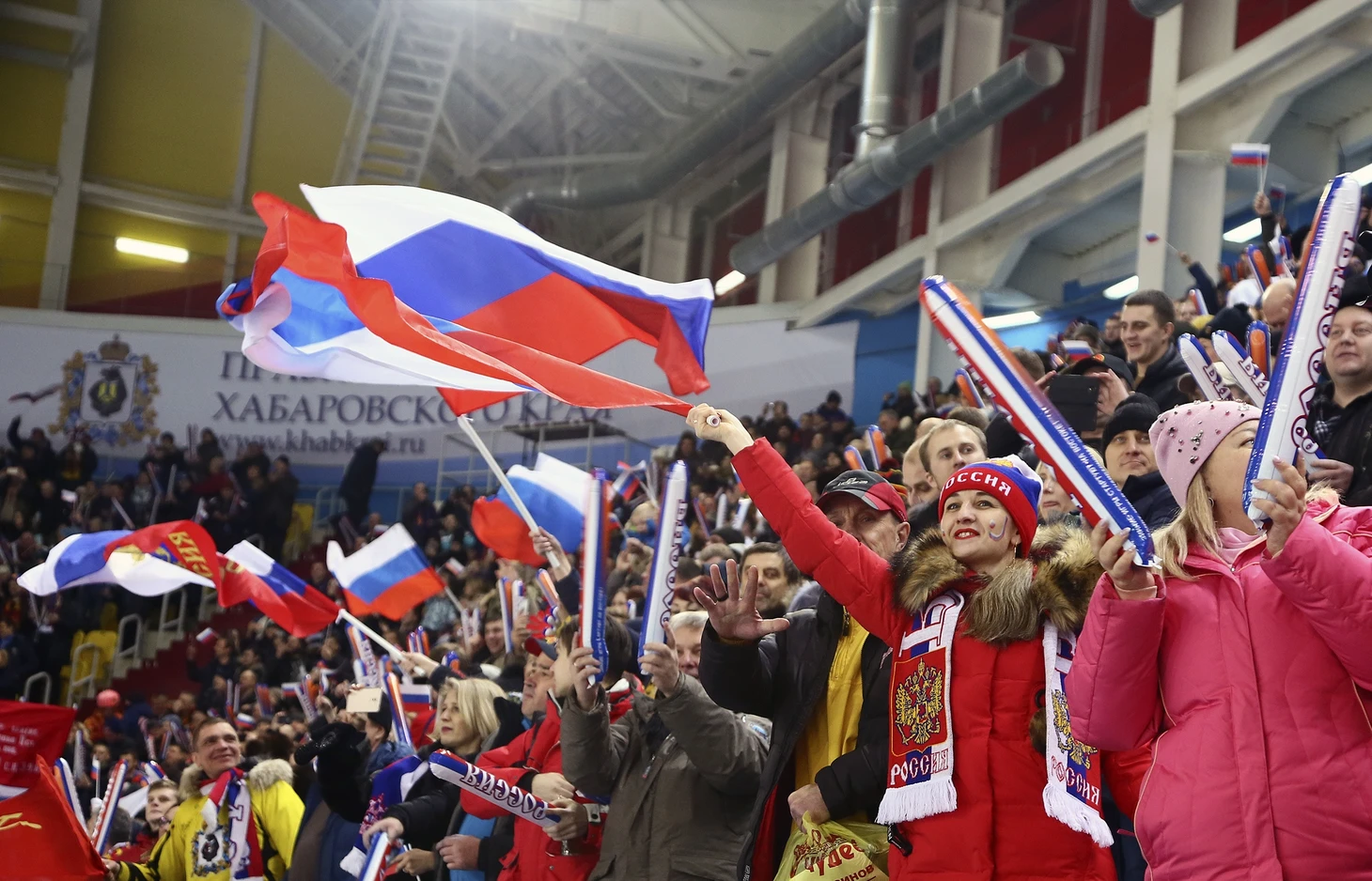 4 февраля 2018. Хабаровск, «Ерофей-Арена». Финальный матч ХХXVIII чемпионата мира Россия — Швеция — 5:4. Девять тысяч зрителей приветствуют победу российской сборной