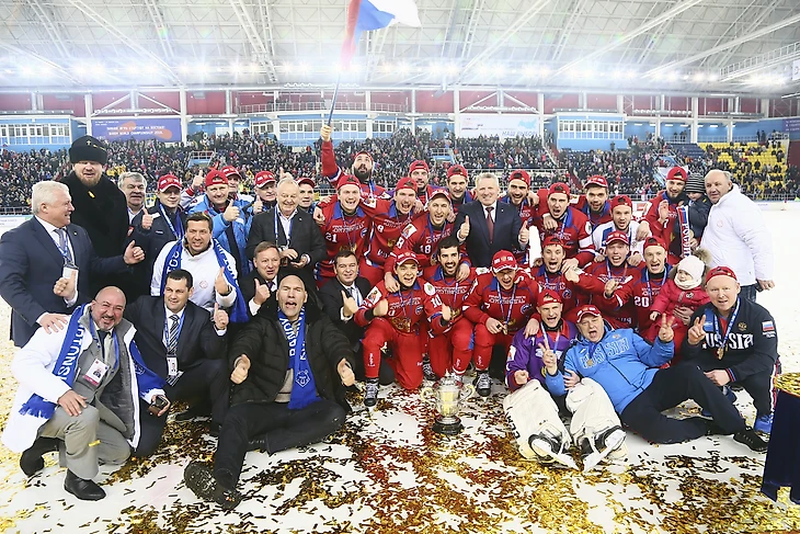 4 февраля 2018. Хабаровск, «Ерофей-Арена». Сборная России — победитель ХХXVIII чемпионата мира. Сидят (слева направо): Николай Сергеевич Валуев (член исполкома ФХМР), Роман Черных, Владислав Анатольевич Спинка (менеджер). Первый ряд: Сергей Назарович Гришин (директор «Ерофей-Арены»), Андрей Мерзликин (актер), Вадим Гришпун (член исполкома ФХМР, вице-президент FIB), Максим Анатольевич Кастырин (член исполкома ФХМР), Алмаз Миргазов, Андрей Прокопьев, Сергей Ломанов, Павел Булатов, Вадим Чернов, Янис Бефус, Александр Энгельсович Конанов (массажист). Второй ряд: Николай Михайлович Чупров (министр спорта и молодежной политики Хабаровского края), митрополит Хабаровский и Приамурский Владимир, Александр Федосов (заместитель председателя правительства Хабаровского края), Иван Андреевич Гришин (врач), Михаил Юрьевич Юрьев (главный тренер), Николай Борисович Емсенко (тренер), Андрей Юрьевич Пашкин (тренер), Борис Иванович Скрынник (президент ФХМР), Алексей Александрович Гаранин (врач), Юрий Шардаков, Алан Джусоев, Максим Ишкельдин, Денис Рысев, Сергей Шабуров, Артем Бондаренко, Вячеслав Иванович Шпорт (губернатор Хабаровского края), Михаил Прокопьев, Юрий Викулин, Евгений Дергаев, Вадим Архипкин, Василий Грановский, Андрей Борисович Сельский (член исполкома ФХМР, президент ХК «Кузбасс»)