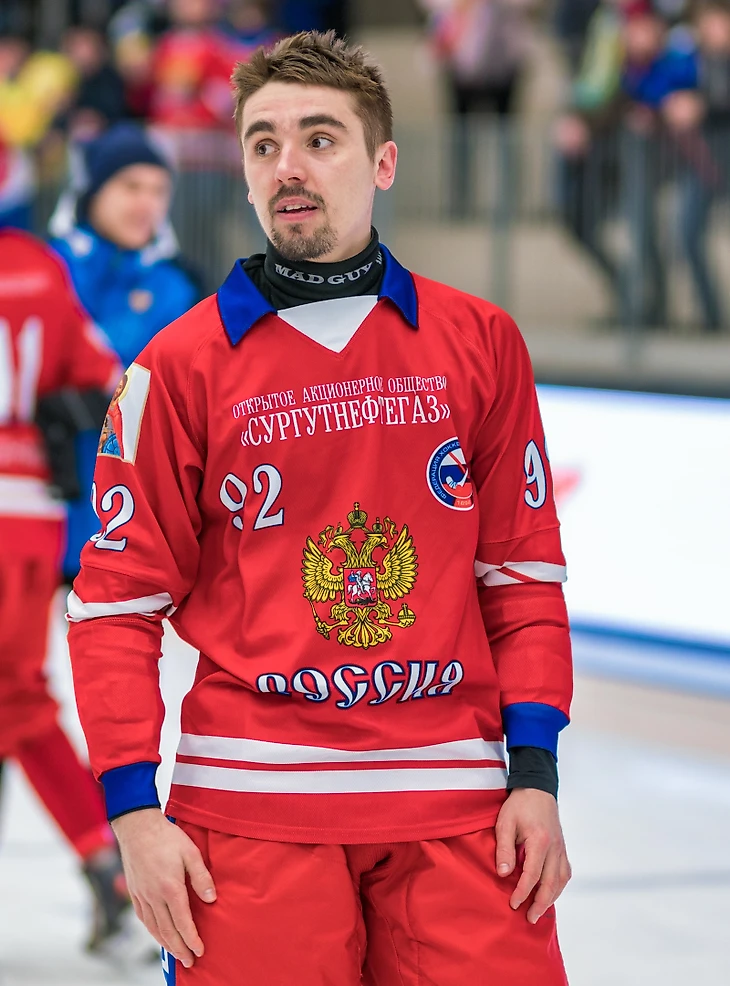 2 февраля 2019. Венерсборг, арена «Венерсборг». Сборная России после победы в овертайме финального матча XXXIX чемпионата мира над сборной Швеции — 6:5. Сидят (слева направо): Владимир Каланчин, Федор Мерзликин (сын известного актера Андрея Мерзликина), Роман Черных, Вадим Чернов, Андрей Прокопьев. Средний ряд: Янус Бефус, Максим Василенко, Алан Джусоев. Третий ряд: ?, Мартти Теппонен (президент клуба «Вейтеря», Финляндия), Игорь Александрович Ананских (депутат Государственной думы РФ), Артем Ахметзянов, Юрий Викулин, Дмитрий Савельев, Василий Грановский, Максим Ишкельдин, Дмитрий Макаров, Александр Егорычев, Алмаз Миргазов, Евгений Дергаев, Ольга Юрьевна Голодец (вице-премьер РФ), Борис Иванович Скрынник (президент FIB и ФХМР), Максим Анатольевич Кастырин (директор по развитию ФХМР)