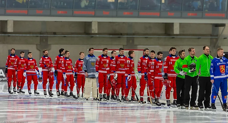 1 февраля 2019. Венерсборг, арена «Венерсборг». Полуфинальный матч XXXIX чемпионата мира Россия — Финляндия — 6:2. На фото слева направо: Вилле Аалтонен (капитан сборной Финляндии), Кристоффер Эрикссон, Кент Айдешьё, Пер-Эрик Якобссон (судейская бригада из Швеции), Юрий Викулин, Роман Черных, Андрей Прокопьев, Дмитрий Савельев, Василий Грановский, Вадим Чернов, Евгений Дергаев, Максим Василенко, Артем Бондаренко, Денис Рысев, Янис Бефус, Дмитрий Макаров, Алан Джусоев, Александр Егорычев, Алмаз Миргазов, Артем Ахметзянов, Максим Ишкельдин