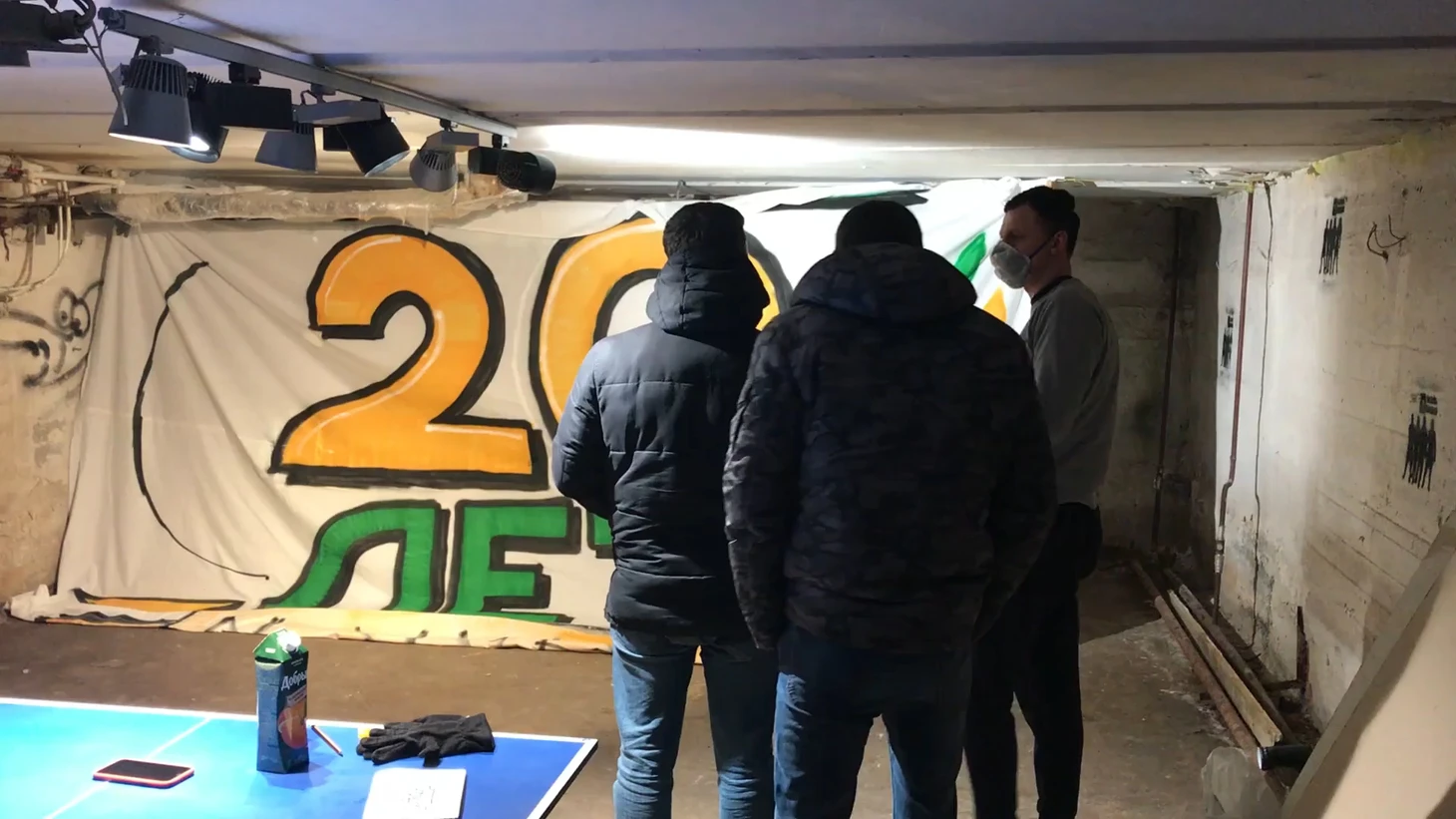 По прибытии в город на Северной Двине, который мог называться северной столицей, если бы не появление на карте России Санкт-Петербурга 300 с лишним лет назад, мы вопреки обычному досугу людей в 10 вечера отправились в подвал. Да-да вам не показалось, именно в подвал! Причиной тому оказались местные фанаты-художники, заканчивающие своё произведение искусства. Полотнище было приурочено к 20-летию фанатского движение местной команды "Водник".