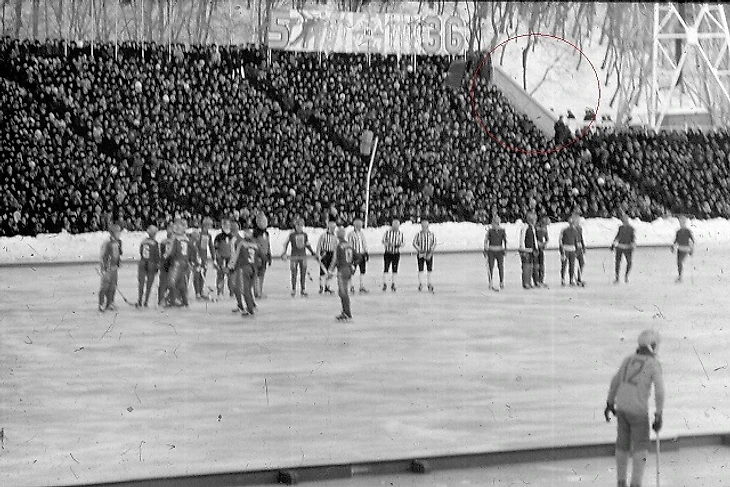 Матч по хоккею с мячом на стадионе имени Ленина в 1981 году. В красном круге – лестница Восточной трибуны, на которой произошла трагедия