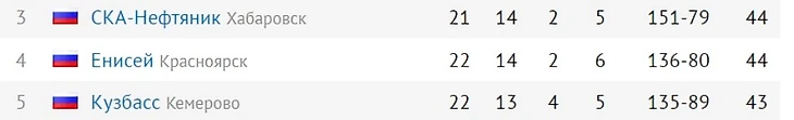 Итог: "Кузбасс" - 55, "Енисей"- 54 и "СКА-Нефтяник" - 51.