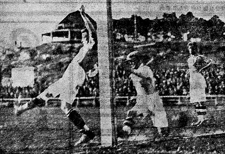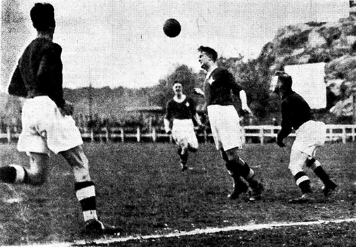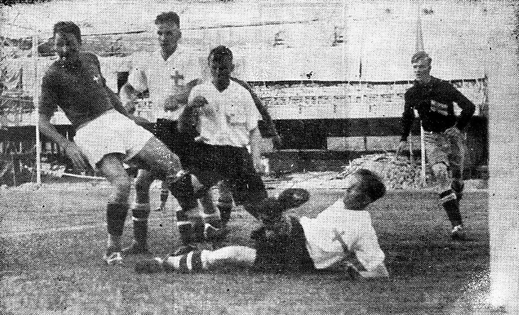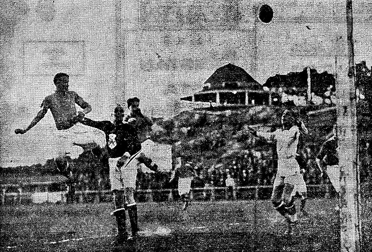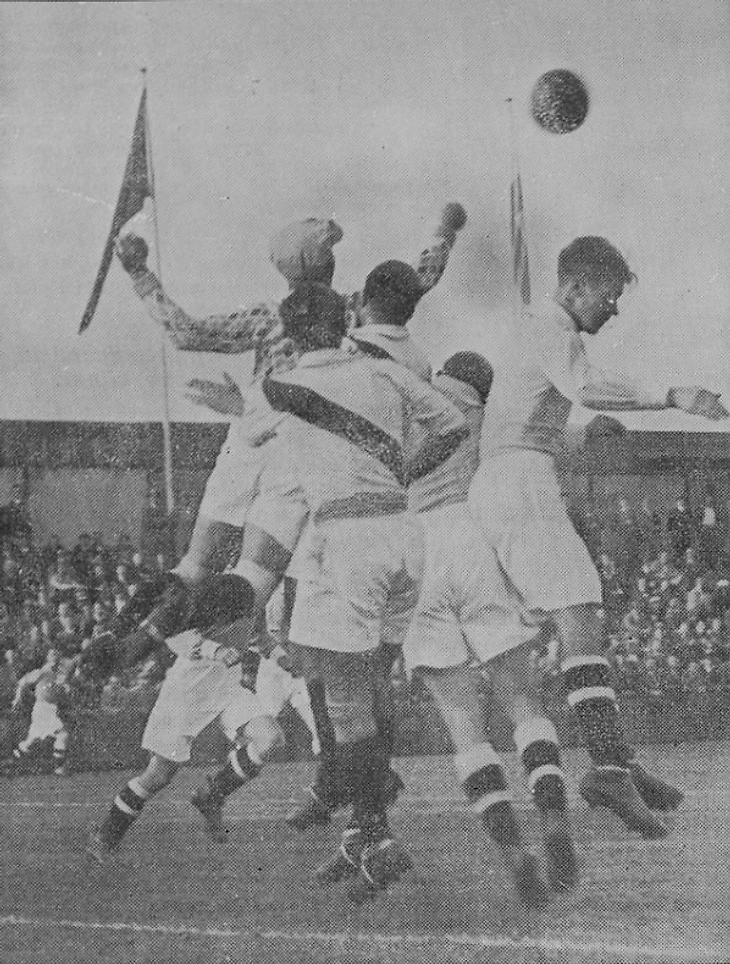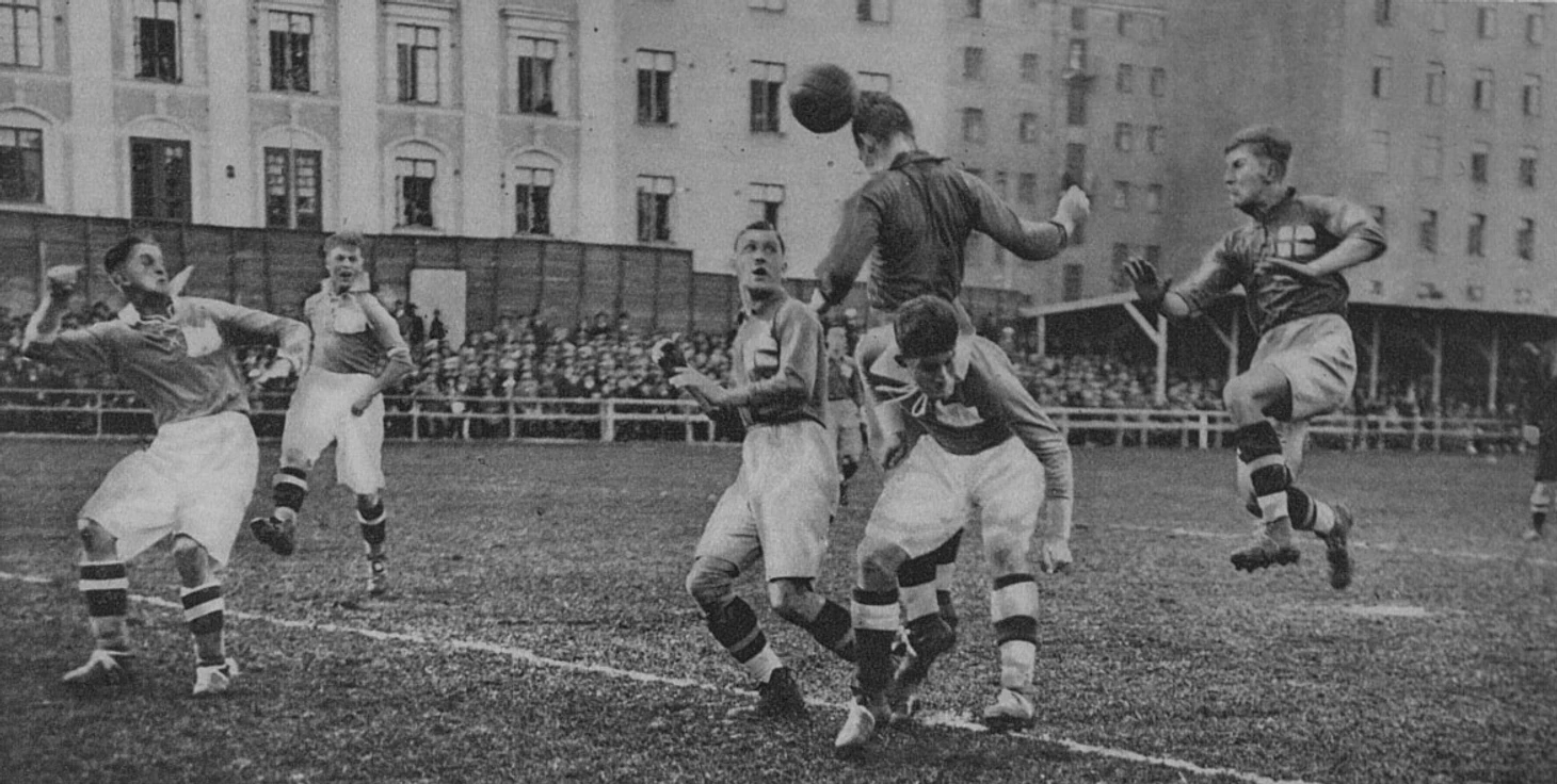 13 января 1929 года. Хельсинки. Стадион «Тёёлён Паллокенття». ХИФК - КИФ - 3:1 (0:0). Розыгрыш углового удара у ворот «Камратерны». «Карягин по-простому выбивает мяч, Лённберг готов помочь». Фото из газеты «Хювюдстадсбладет» от 14 января 1929 года
