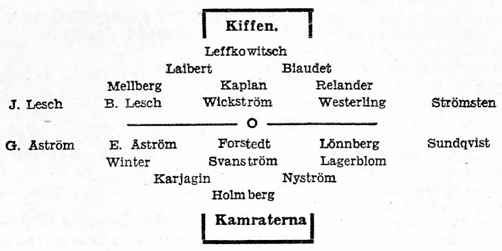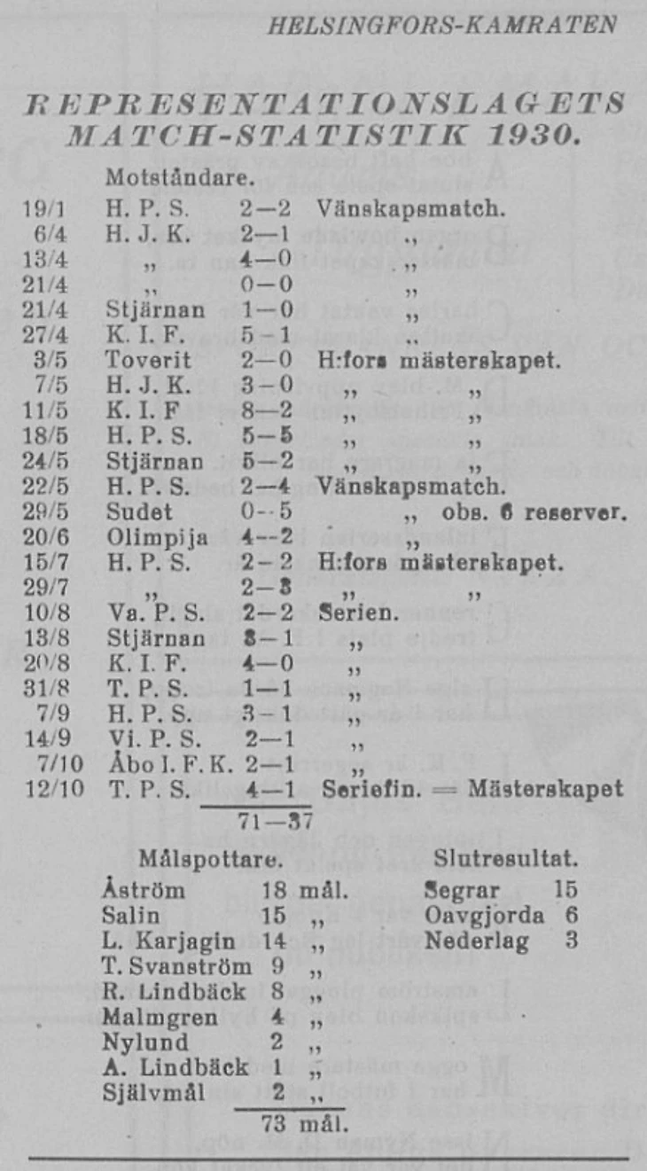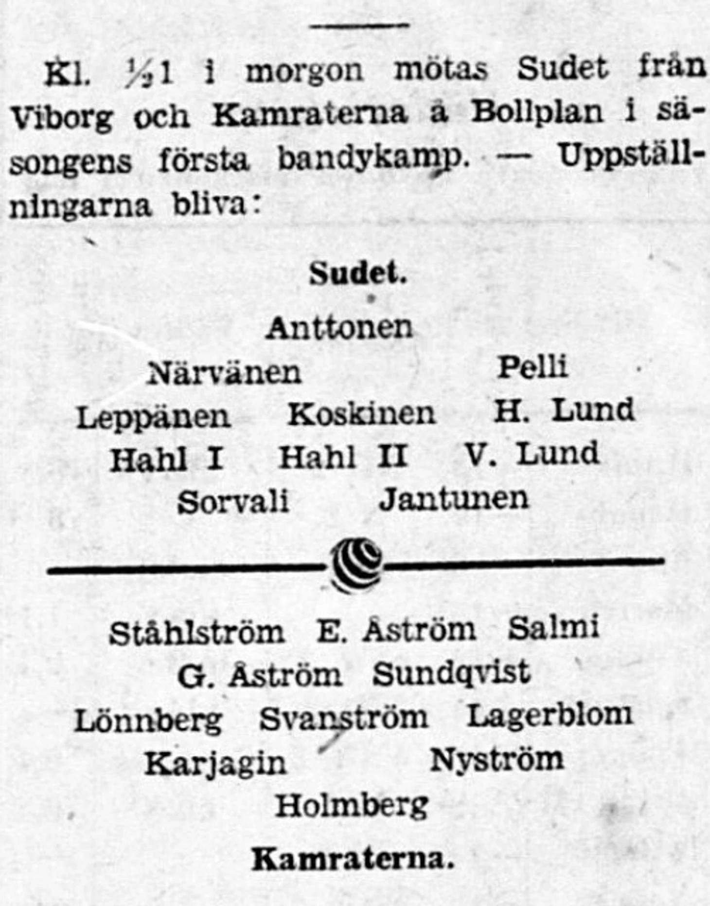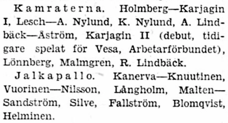 Составы хоккейных команд ХИФК / «Камратерна» (Хельсинки) и «Виипурин судет» (Выборг) на первый матч сезона (1:2), играемый только 1 января 1929 года из-за позднего прихода зимы и на первый матч Ф. Карягина за «Камратерну» (газета «Свенска прессен» от 31 декабря 1928 года)