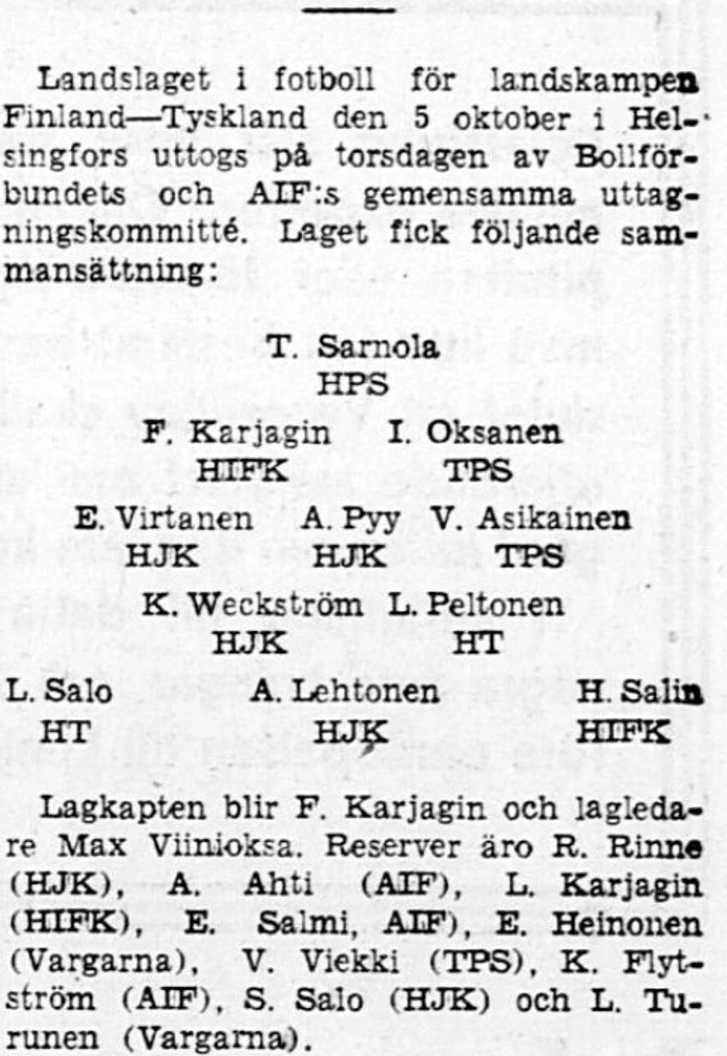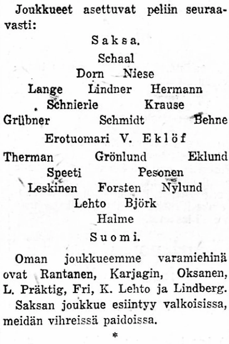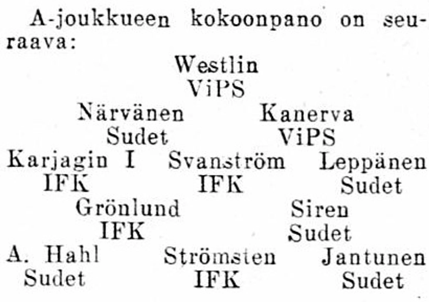 Ориентировочные составы, включая финских запасных, на матч 20 июля 1928 года между сборными Финляндии TUL и Германии (2:4, счет первого тайма 1:3) из газеты «Суомен сосиалидемокраатти» от 19 июля 1928 года. «Немецкая команда выступает в белых футболках, наша - в зеленых»