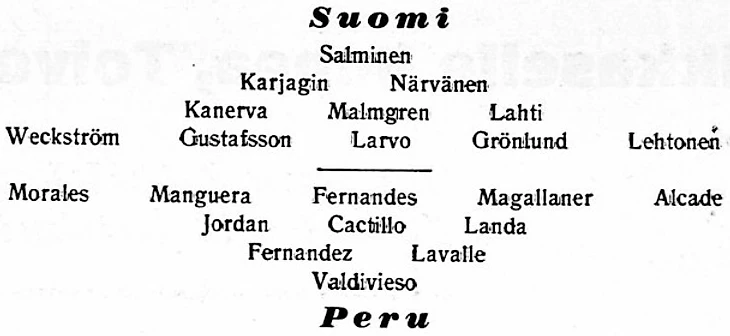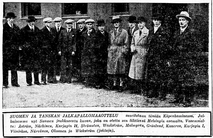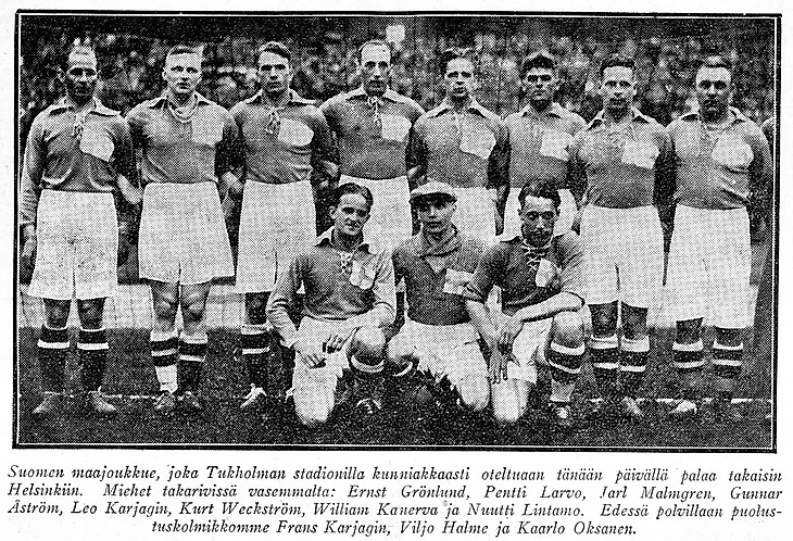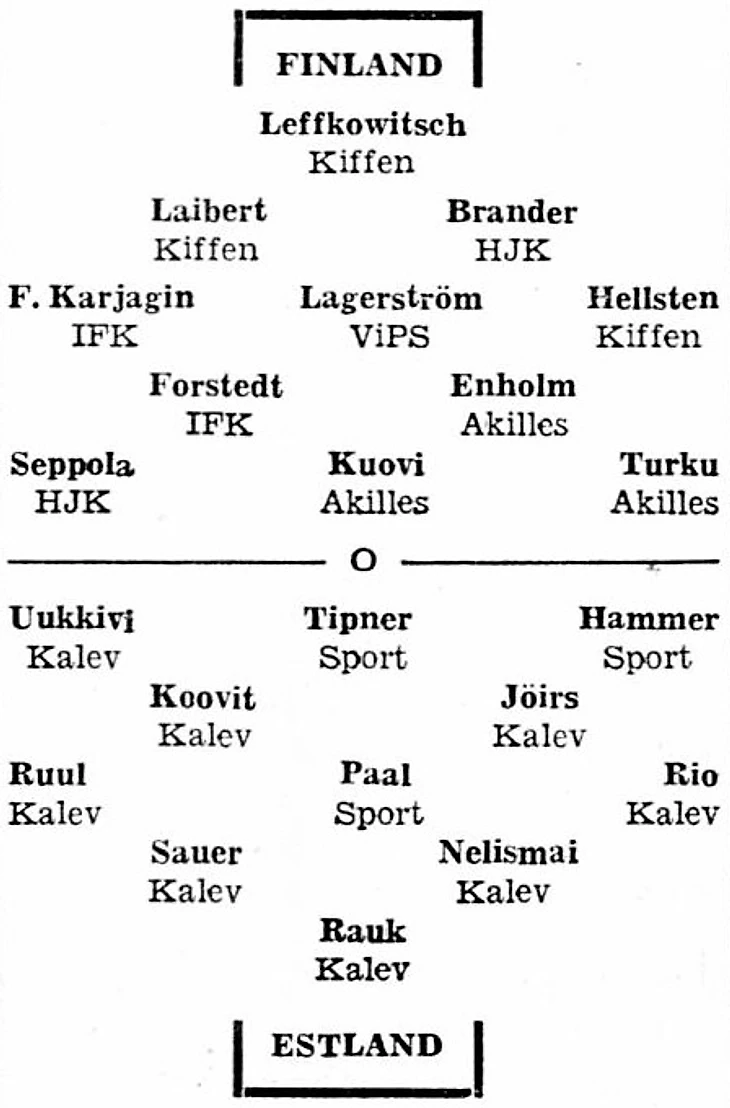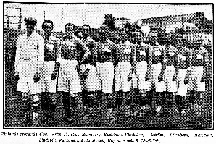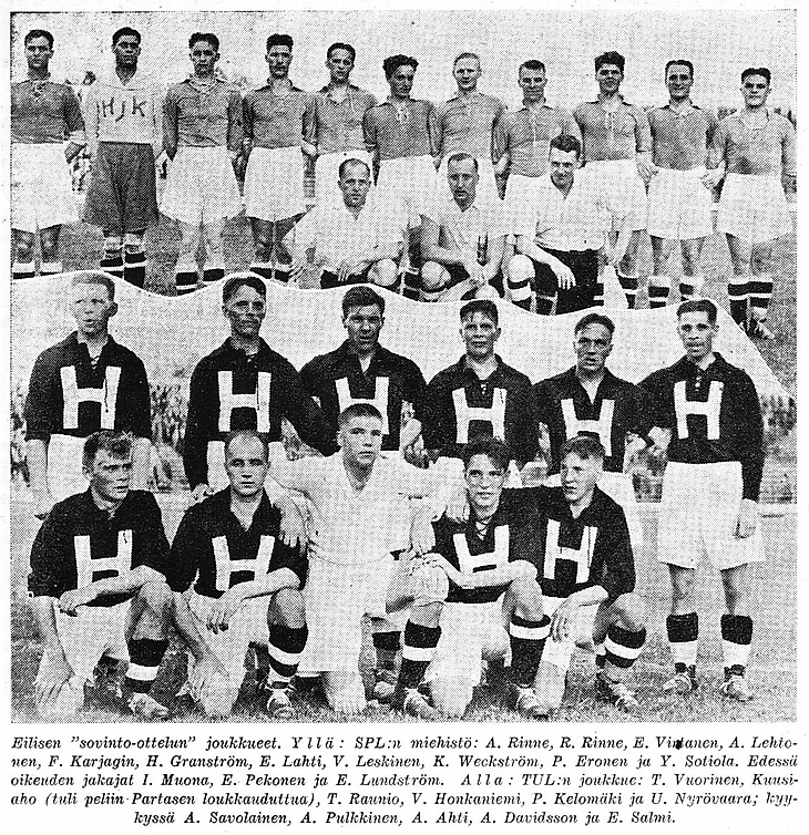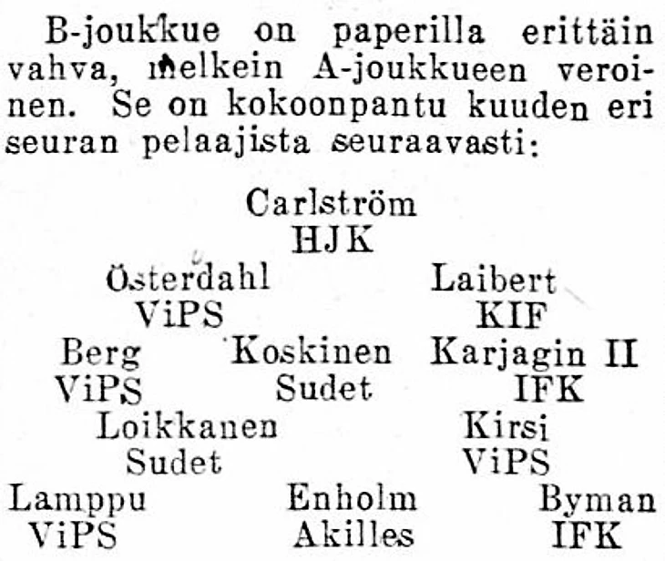 Ориентировочные составы, включая финских запасных, на матч 20 июля 1928 года между сборными Финляндии TUL и Германии (2:4, счет первого тайма 1:3) из газеты «Суомен сосиалидемокраатти» от 19 июля 1928 года. «Немецкая команда выступает в белых футболках, наша - в зеленых»