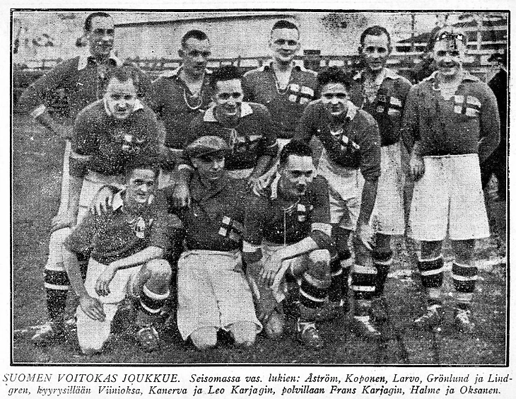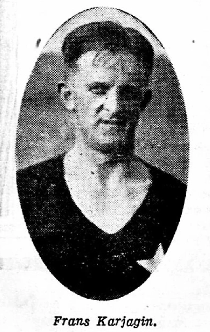 Август 1928 года. Хельсинки. Сборная Финляндия TUL. «Наши сильные футболисты на Спартакиаде победили команды из Англии, Швейцарии, Сибири и Поволжья. Проиграли они с небольшой разницей только известным уругвайским игрокам. Сейчас наши футболисты находятся в Одессе и вернутся в Финляндию в середине сентября». Франс Карягин - второй справа (журнал «Тюёвяен урхейлулехти» № 35 от 30 августа 1928 года)