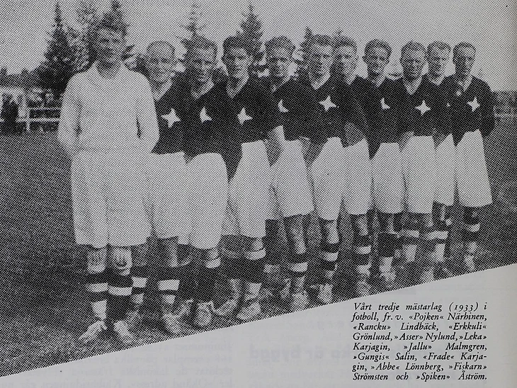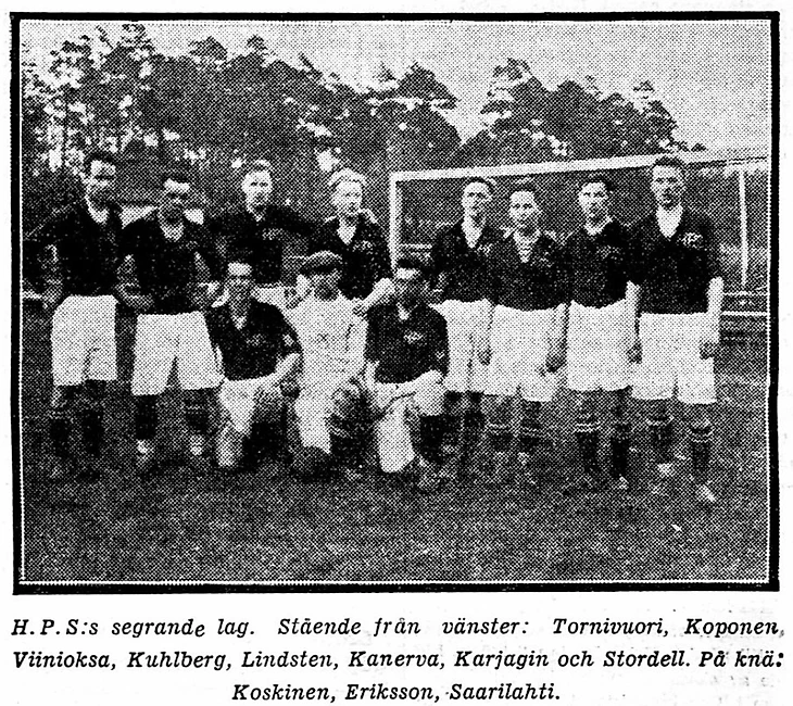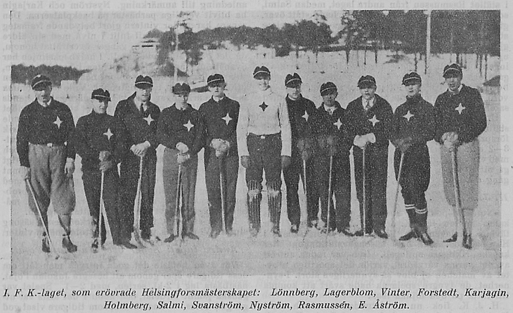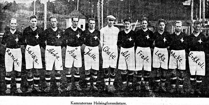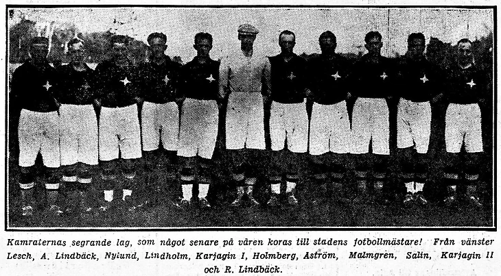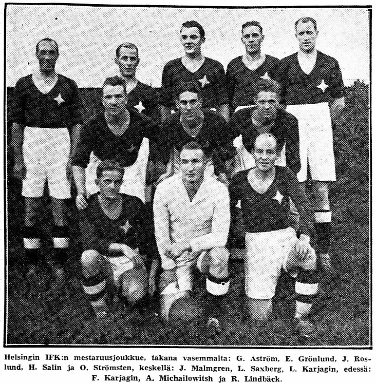 10 марта 1929 года. Хельсинки. Стадион «Тёёлён Паллокенття». «Камратерна» / ХИФК - чемпион Хельсинки после победы (4:2) над ХИКом (слева направо): Лённберг (Lönnberg), Лагерблом (Lagerblom), Винтер (Vinter), Форштедт (Forstedt), Ф. Карягин (Karjagin), Холмберг (Holmberg), Салми (Salmi), Сванстрём (Svanström), Нюстрём (Nyström), Расмуссен (Rasmussen) и Э. Острём (E. Åström). Фото из клубного издания спортивной ассоциации «Камратерна в Хельсинки» (ХИФК) «Гельсингофорс камратен» № 2 за март 1929 года
