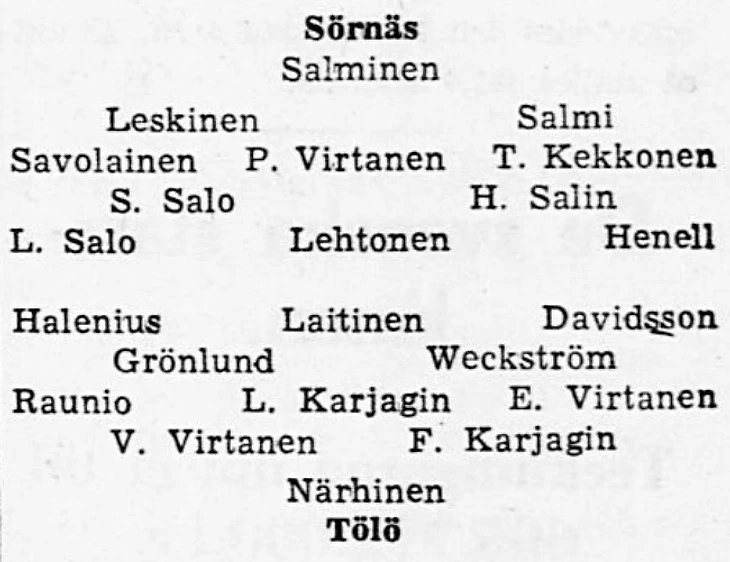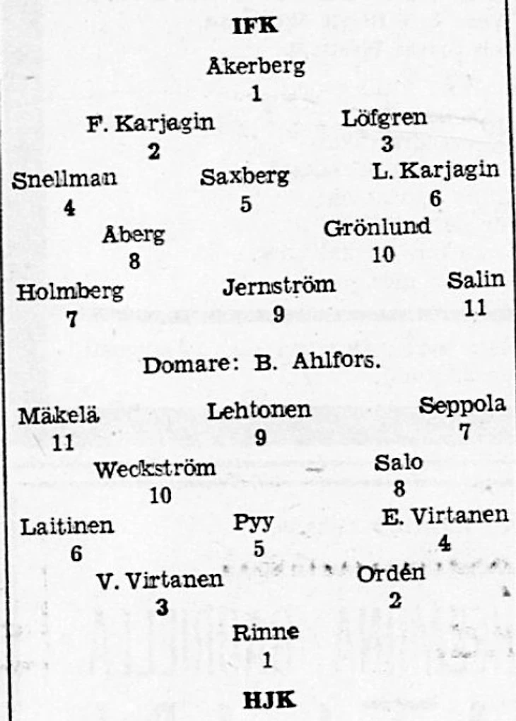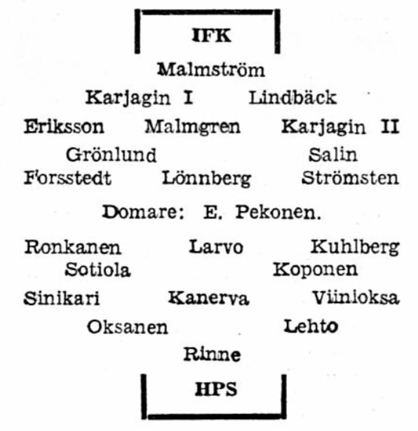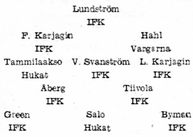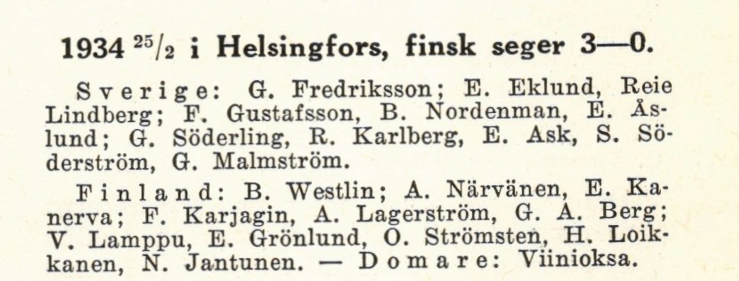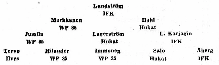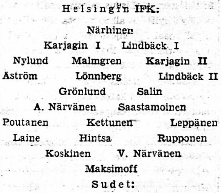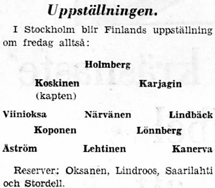 Стартовый состав сборной Финляндии на матч 28 февраля 1943 года в Хельсинки со сборной Швеции (газета «Хювюдстадсбладет» за 24 февраля 1943 года)