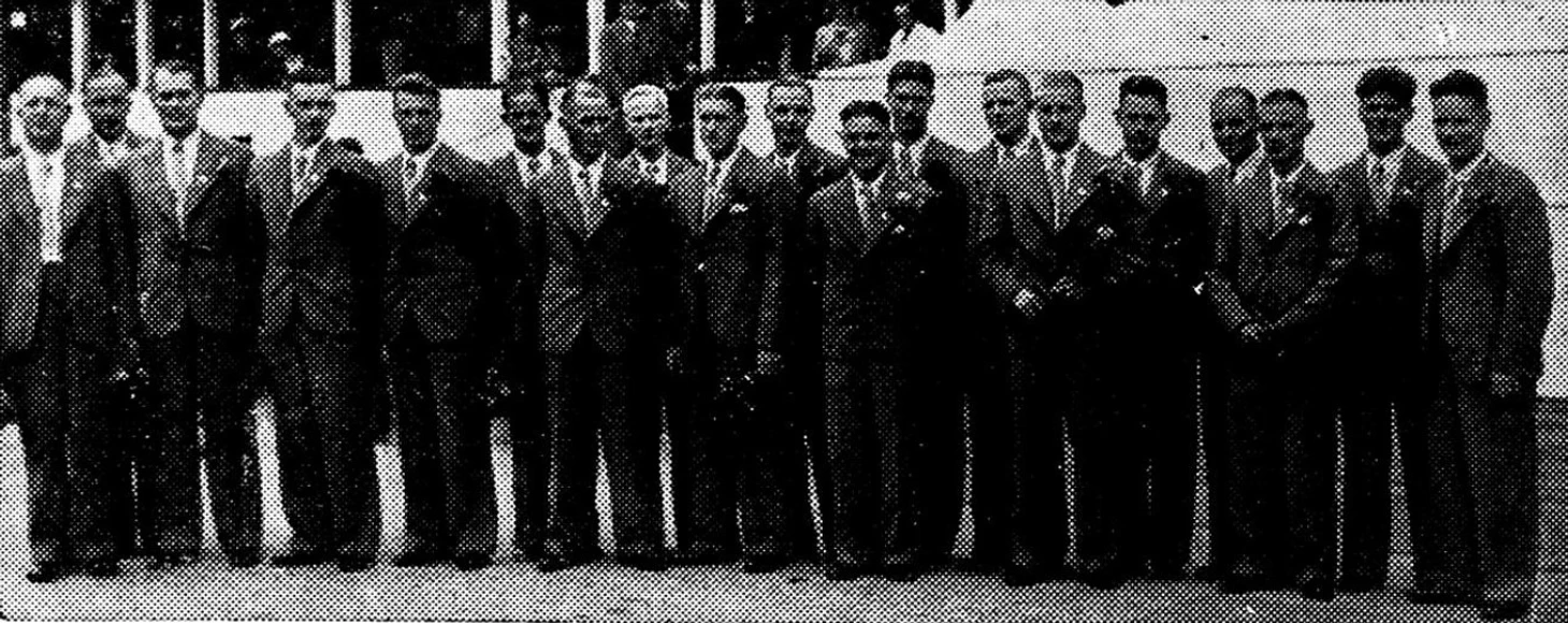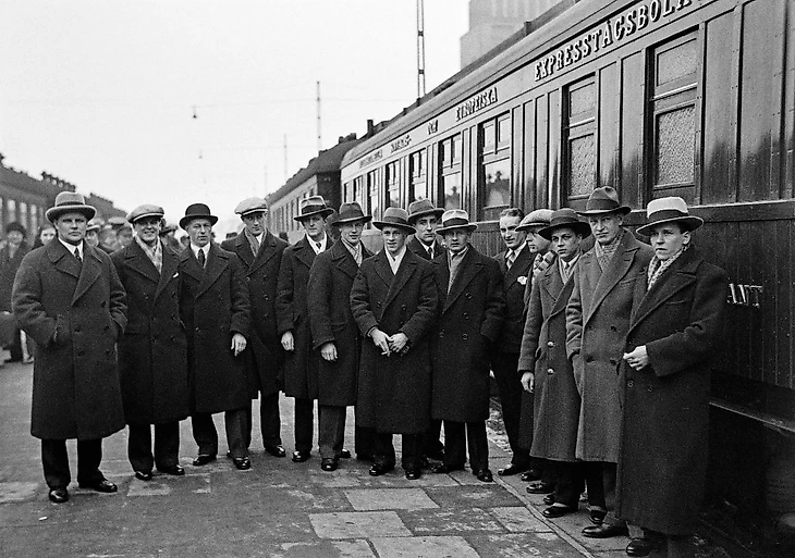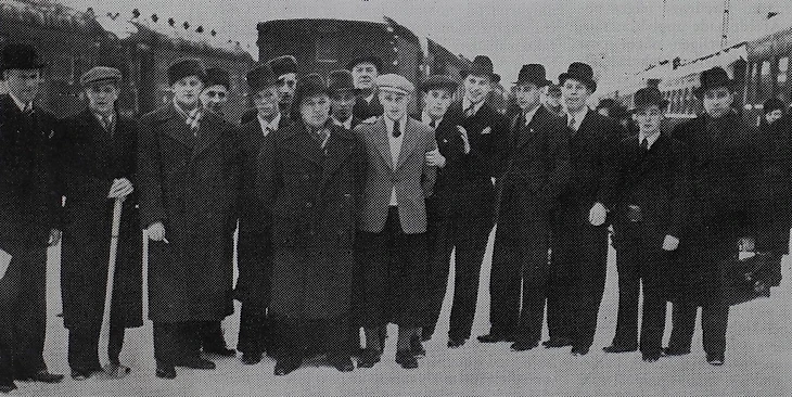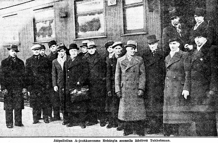 26 декабря 1940 года. Хельсинки. Вокзал. Команда ХИФК перед отъездом в Швецию. Где-то на этом снимке Франс и Лео Карягины, Паул Васильев-Ваннер и Константин Самсонов (газета «Хювюдстадсбладет» от 27 декабря 1947 года)