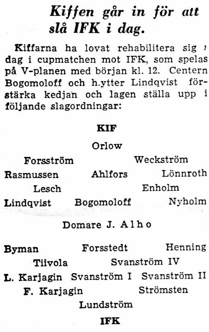 14 февраля 1943 года. Хельсинки. Стадион «Тёлён Паллокенття». Поле «Вяйнямёйнен». Кубок SPL по хоккею с мячом («Чемпионат военного времени 1943 года»). Полуфинал. КИФ - ХИФК - 4:10. Ориентировочные составы. Карягины против Орлова и Богомолова (газета «Хювюдстадсбладет» за 14 февраля 1943 года)