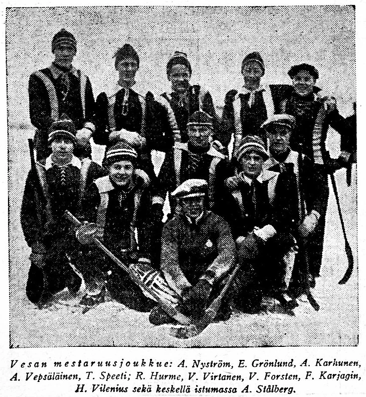 12 февраля 1928 года. Хельсинки. «Тюёвяен луйстинрада». Финал чемпионата TUL по хоккею. «Веса» (Тёёлё, Хельсинки) - «Юрю» (Хельсинки) - 2:1 (1:1). Команда чемпионов (стоят слева направо): А. Нюстрём (A. Nyström), Э. Грёнлунд (E. Grönlund), А. Кархунен (A. Karhunen), А. Вепсаляйнен (A. Vepsäläinen), Т. Спети (T. Speeti); в середине (слева направо): Р. Хурме (R. Hurme), В. Виртанен (V. Virtanen), В. Форстен (V. Forsten), Ф. Карягин (F. Karjagin) и Х. Вилениус (H. Vilenius); впереди: вратарь А. Столберг (A. Stålberg). Фото из газеты «Суомен сосиалидемокраатти» от 13 февраля 1928 года