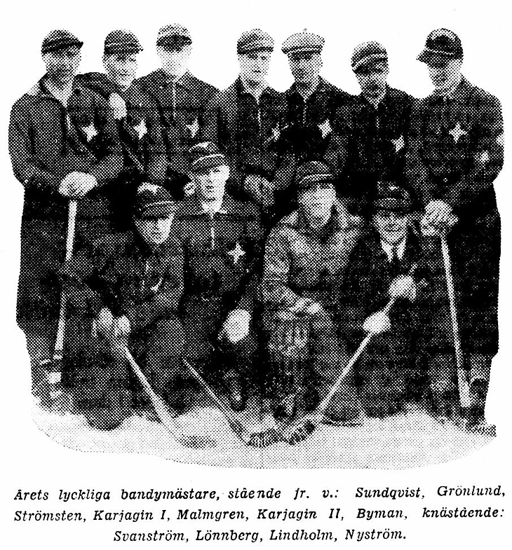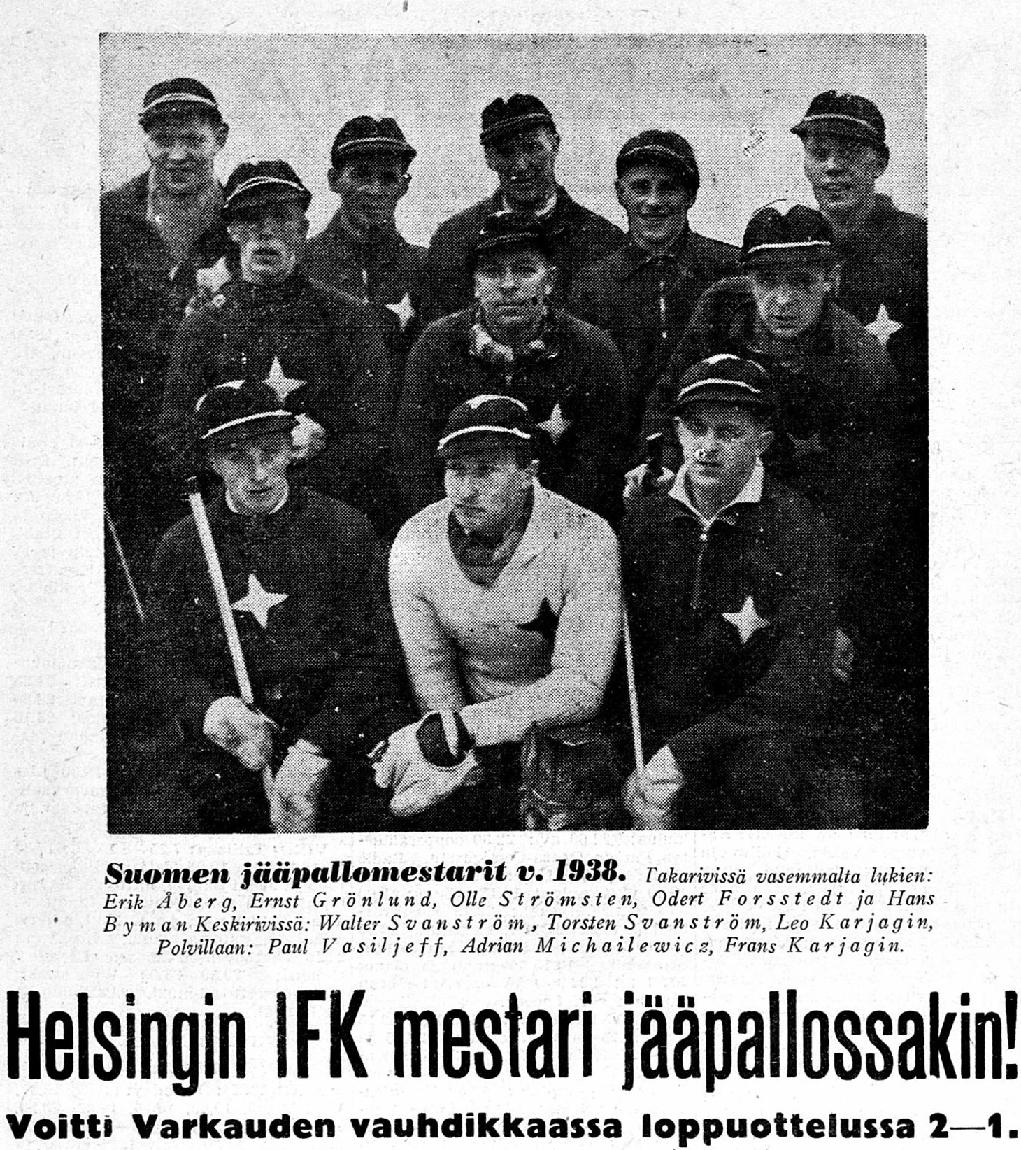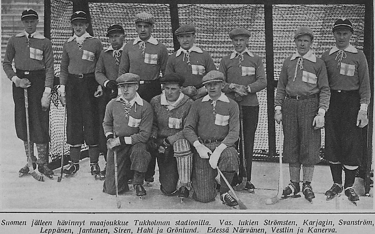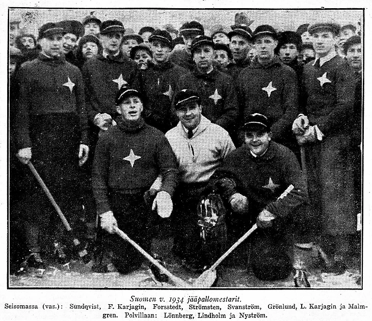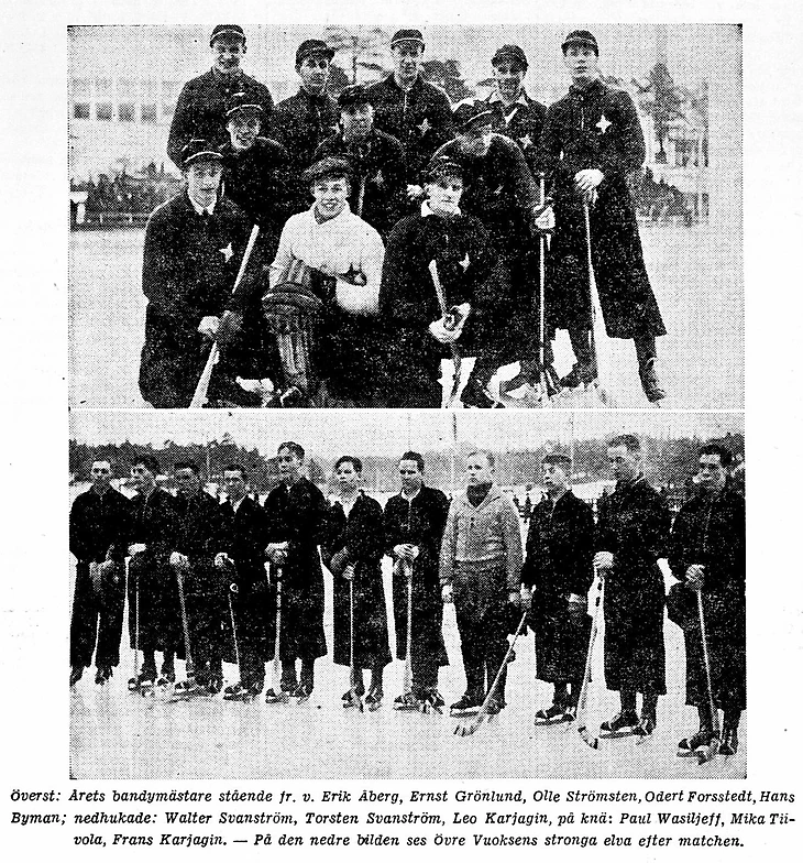 24 февраля 1929 года. Хельсинки. Стадион «Тюёвяен Луйстинрада». Финал чемпионата TUL по хоккею с мячом. «Веса» (Хельсинки) - «Куллерво» (Хельсинки) - 4:3 во втором овертайме; основное время 3:3 (2:2). Состав «Веса» (слева направо): Раунио (Raunio), Экстрём (Ekström), Векстрём (Veckström), Виртанен (Virtanen), Кархунен (Karhunen), Столберг (Ståhlberg), Л. Карягин (Karjagin), Хурме (Hurme), Вилениус (Vilenius), Грёндаль (Gröndahl) и Алхо (Alho). Фото из газеты «Суомен сосиалидемокраатти» от 25 февраля 1929 года