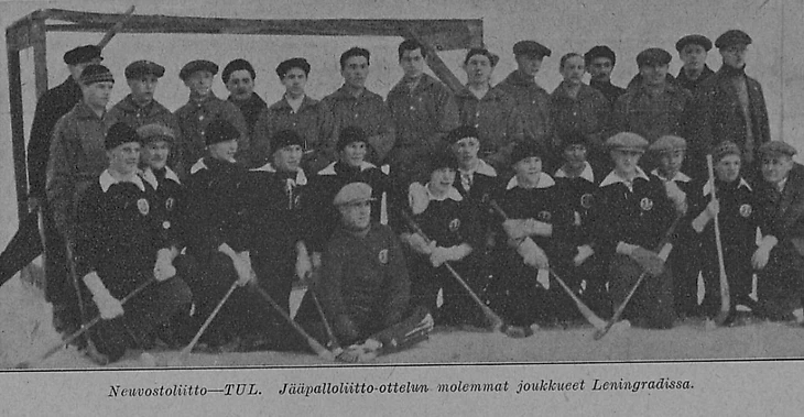 Январь 1928 года. Ленинград. Сборная Финляндии (нижний ряд) Рабочего спортивного союза (TUL) и ленинградские хоккеисты (фото из журнала «Тюёвяен урхейлулехти» № 6 от 9 февраля 1928 года)