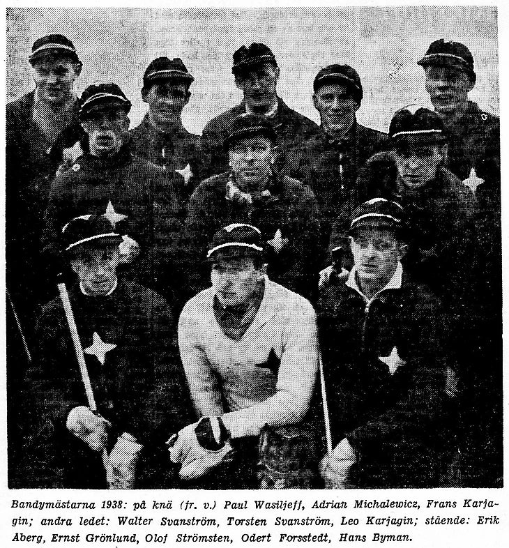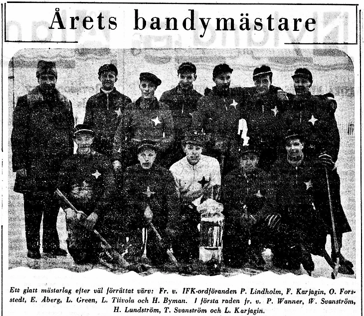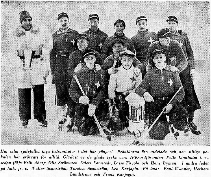 «В ХИФКе отсутствует защитники. Торстен Сванстрём, менеджер ХИФК по хоккею с мячом, собрал свою команду, за исключением защитников. В обороне этой зимой, по-видимому, все еще придется прибегать к помощи ветеранов. Но, может быть, когда команда приступит к тренировкам на катке, молодежь приготовит приятный сюрприз. Сванстрём считает, что в настоящий момент команда будет состоять из следующих игроков: в воротах - Херберт Лундстрём; защитники - Олле Стрёмстен, Фраде Карягин или Торстен Сванстрём; полузащитники - Стуре Сванстрём, Вальтер Сванстрём, Лео Карягин, нападающие: Ниссе Эрнберг, Эрик Оберг, Лассе Грен, Лассе Тиивола и Ханс Бюман. Есть хорошие резервы в лице Налле Лундквиста, Роланда Виика и Т. Розенберга» (газета «Хювюдстадсбладет» за 17 декабря 1944 года).