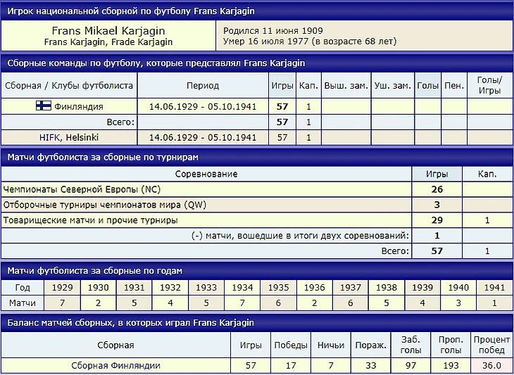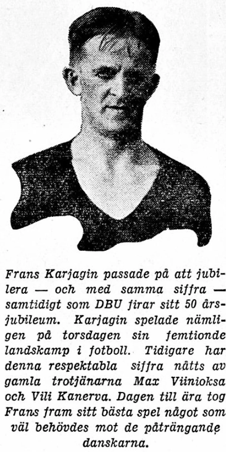 4 августа 1939 года. Хельсинки. Олимпийский стадион. Товарищеский матч. Финляндия - Эстония - 4:2 (0:1). 9-я минута. «Тыловая оборона Финляндии поставлена на колени. Результат близкого удара Ууккиви. Франс Карягин и Туре Сарнола не смогли предотвратить голевой удар» (газета «Хювюдстадсбладет» от 5 августа 1939 года)