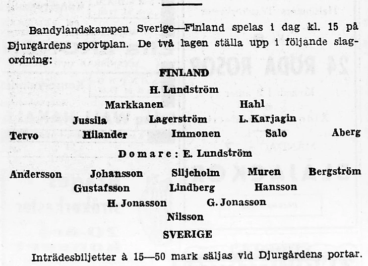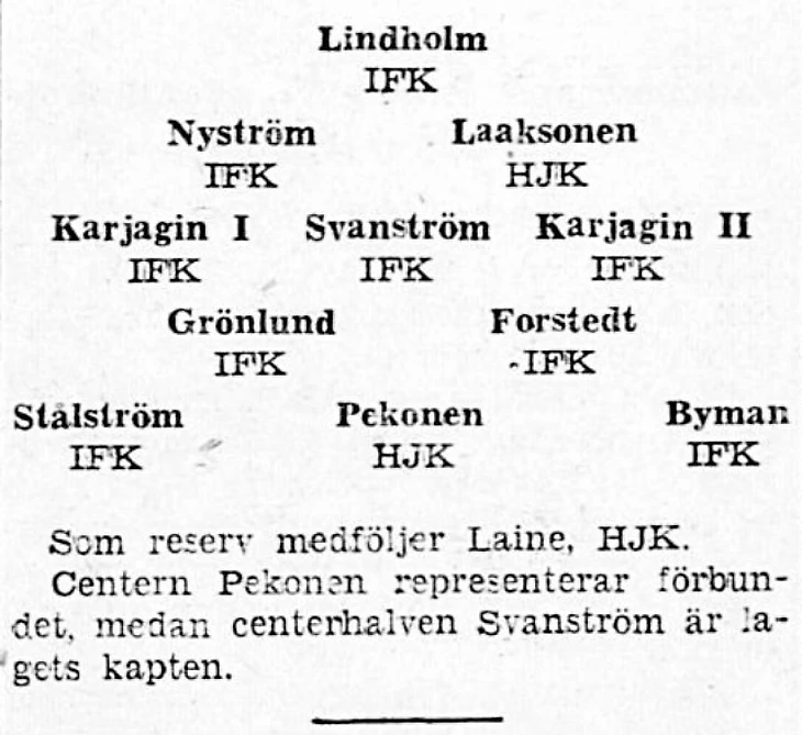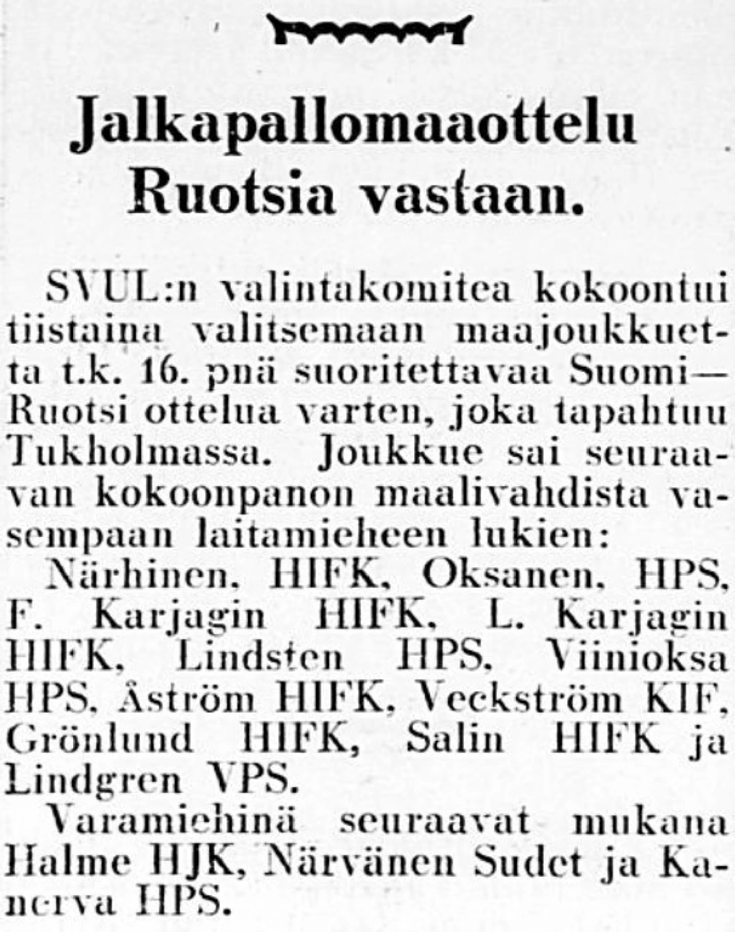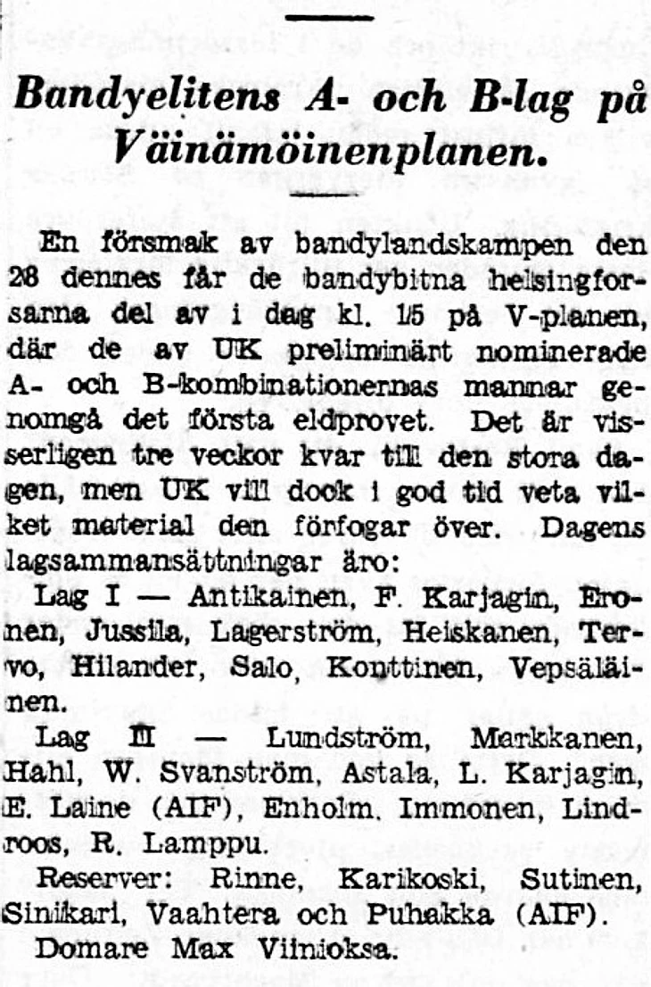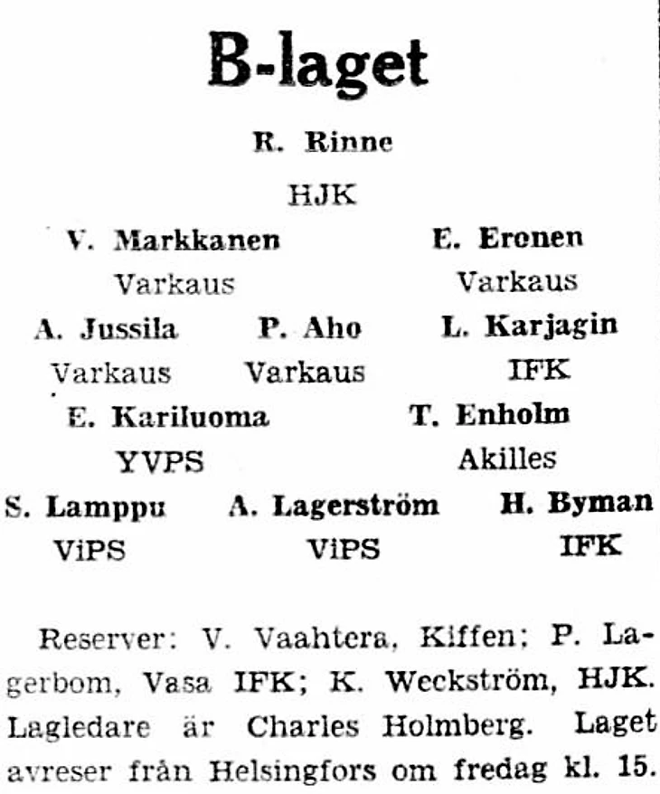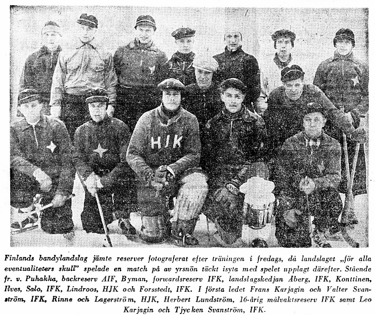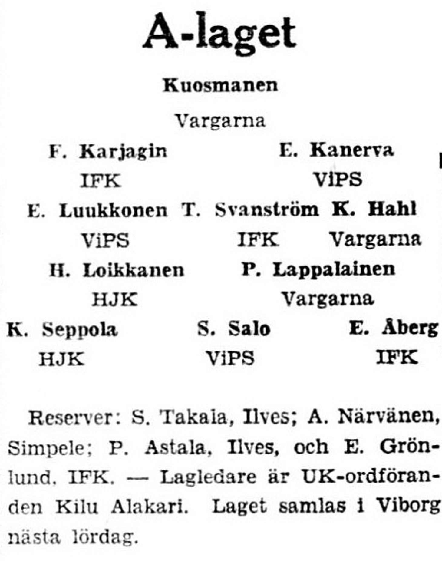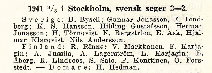 «Вчера вечером были выбраны игроки для участия в воскресном матче по хоккею с мячом в Швеции. Состав национальной команды на игру будет определен утром перед матчем. Список игроков следующий: A. Lagerström (Sudet), P. Konttinen (Ilves), E. Åberg (IFK), R. Lindroos (VP 35), R. Rinne (HJK), S. Takala (Ilves), F. Karjagin (IFK), V. Markkanen (VP 35), L. Karjagin (IFK), A. Jussila (VP 35), O. Forstedt (IFK), S. Salo (Sudet), K. Seppola (HJK) и K. Hahl (Sudet). Первые четверо выезжают сегодня, остальные - завтра, все на самолете. Председатель отборочной комиссии К. Алакари будет выступать в качестве сопровождающего» (газета «Або ундерряттелсэр» от 7 марта 1941 года)