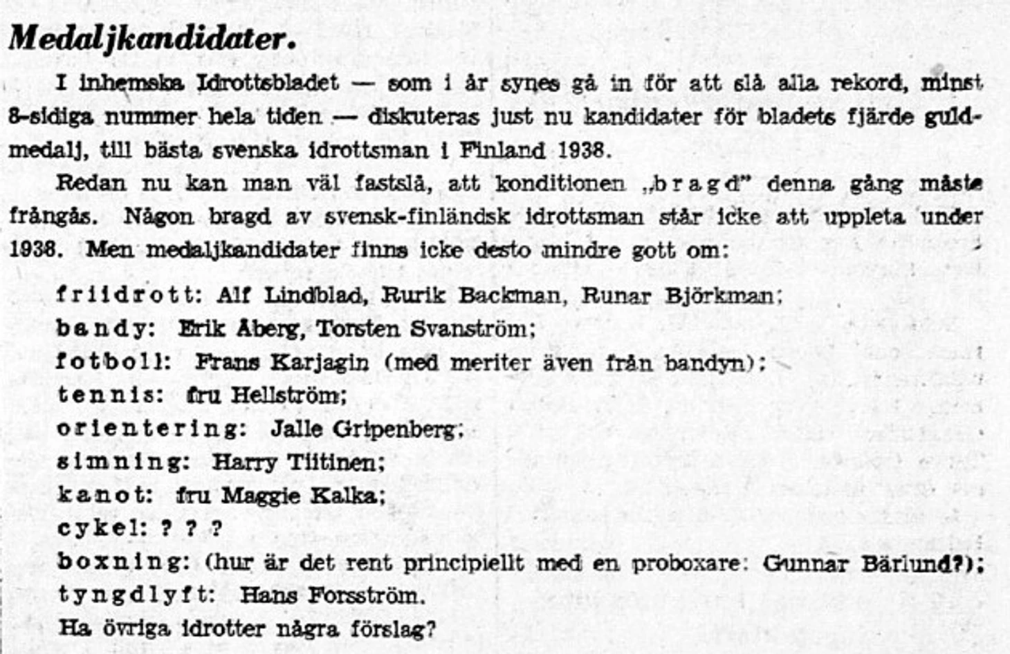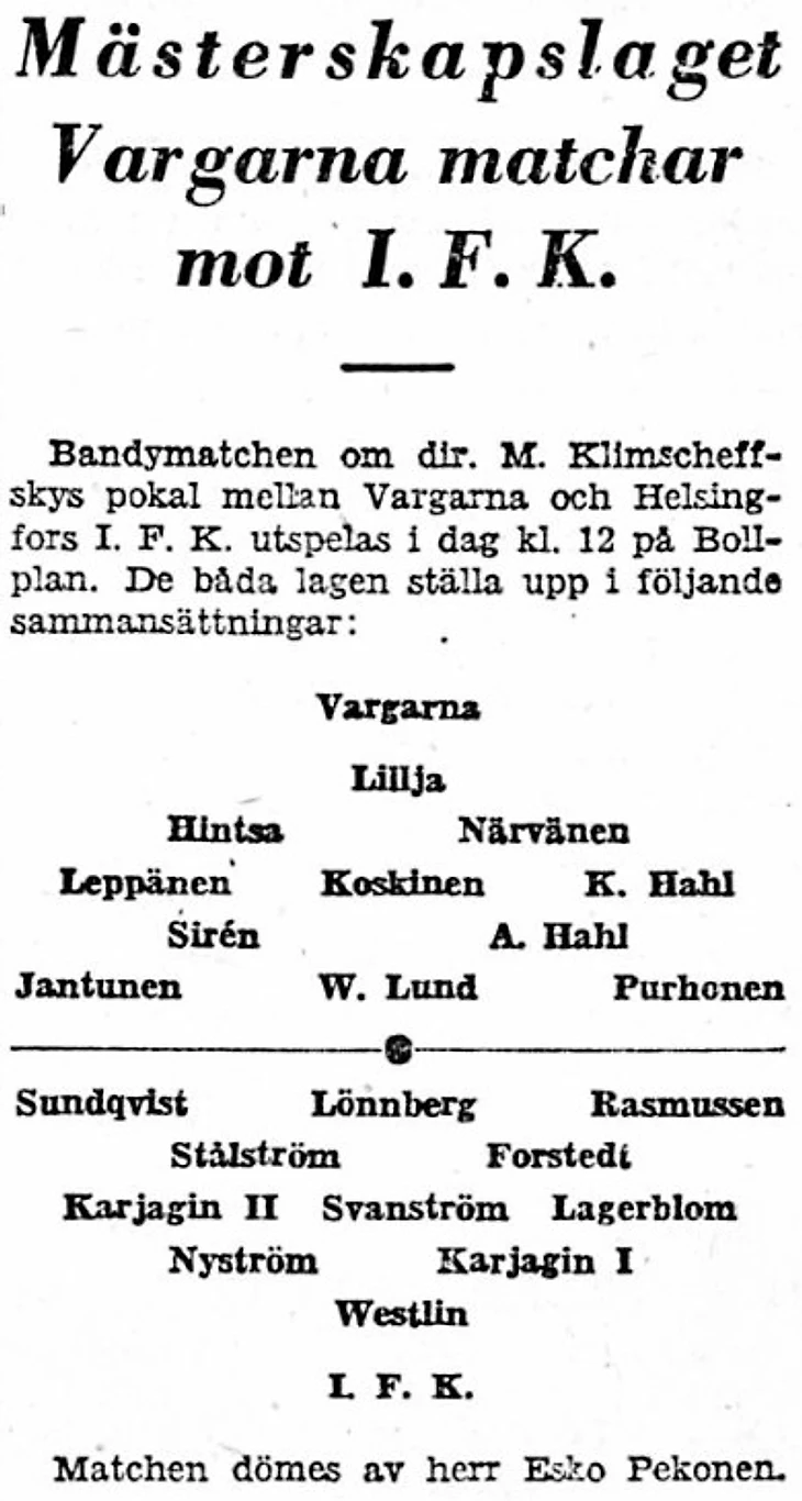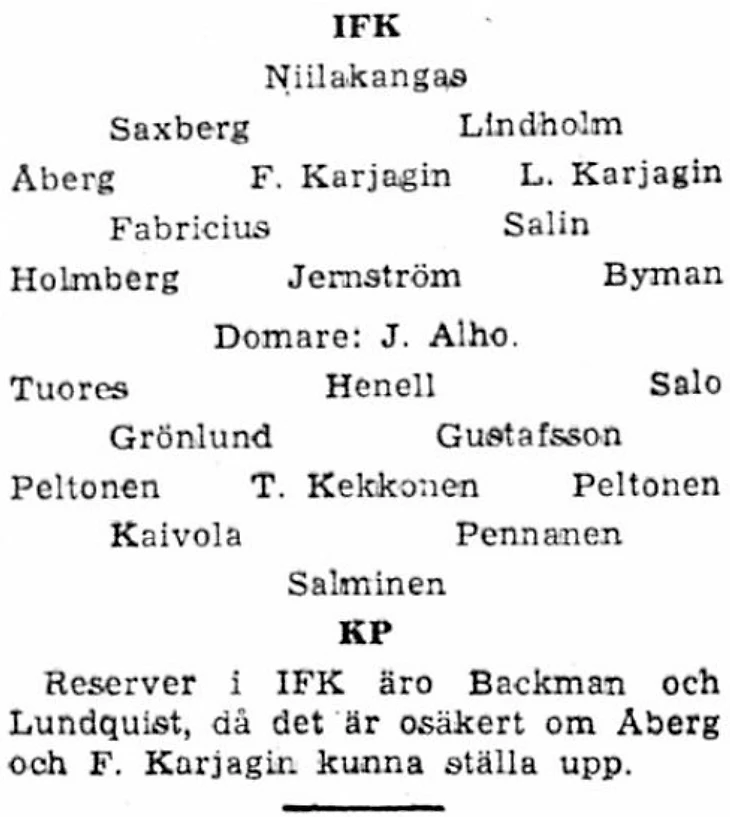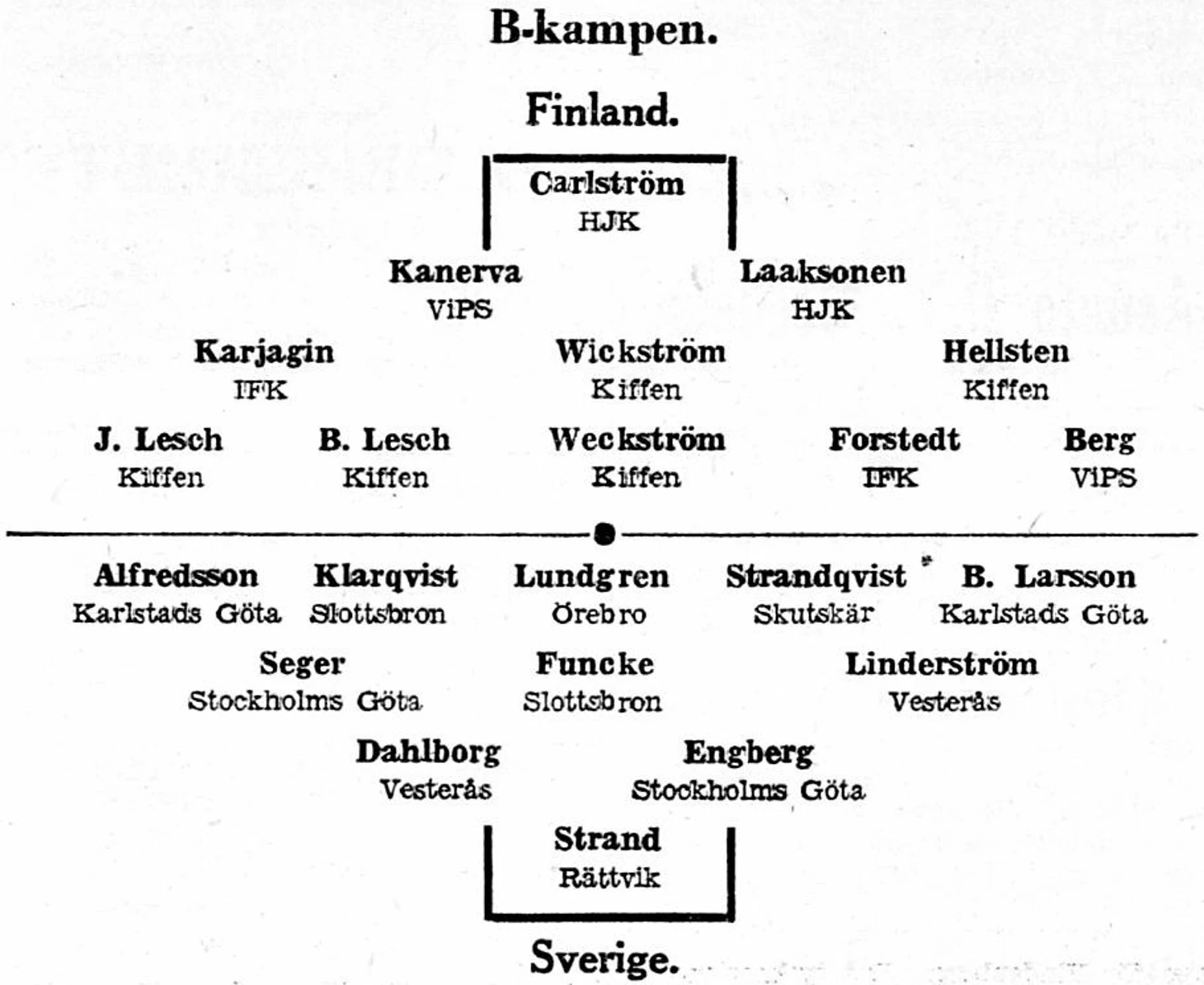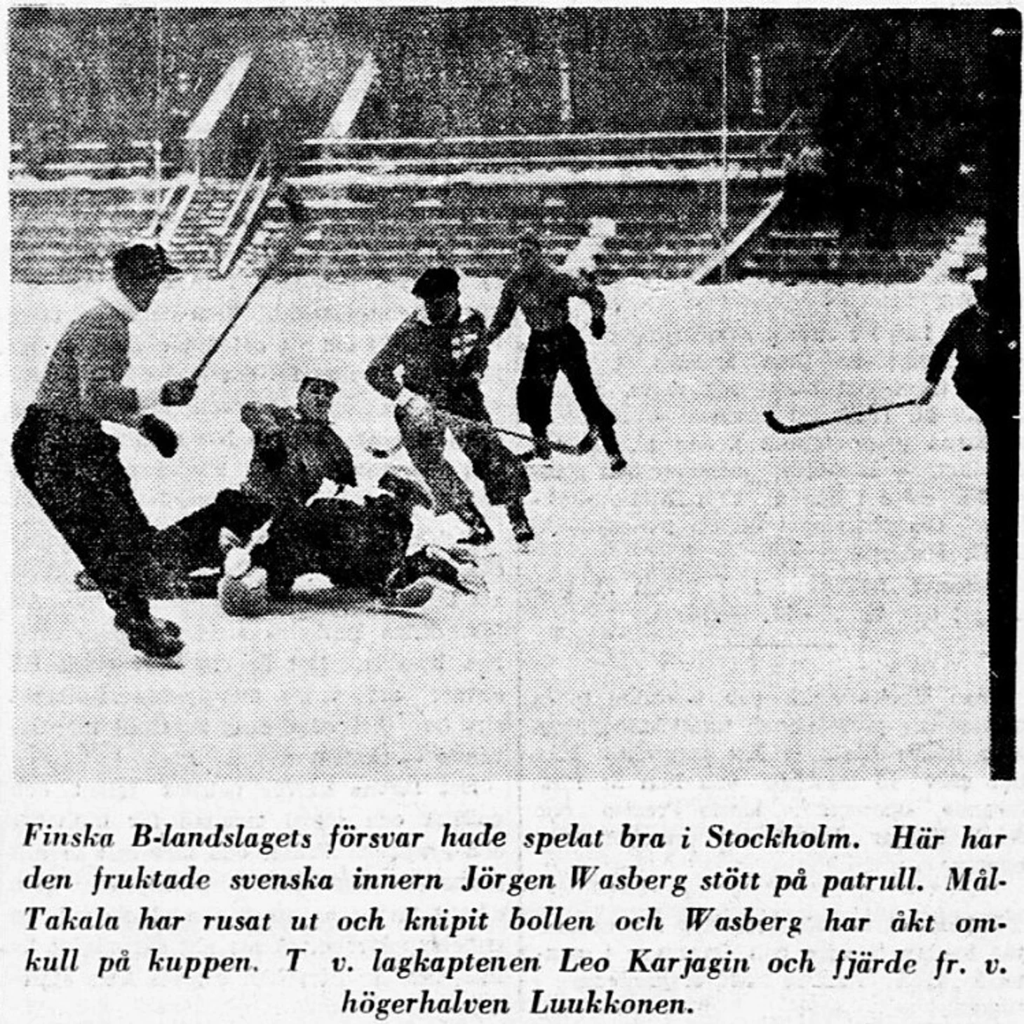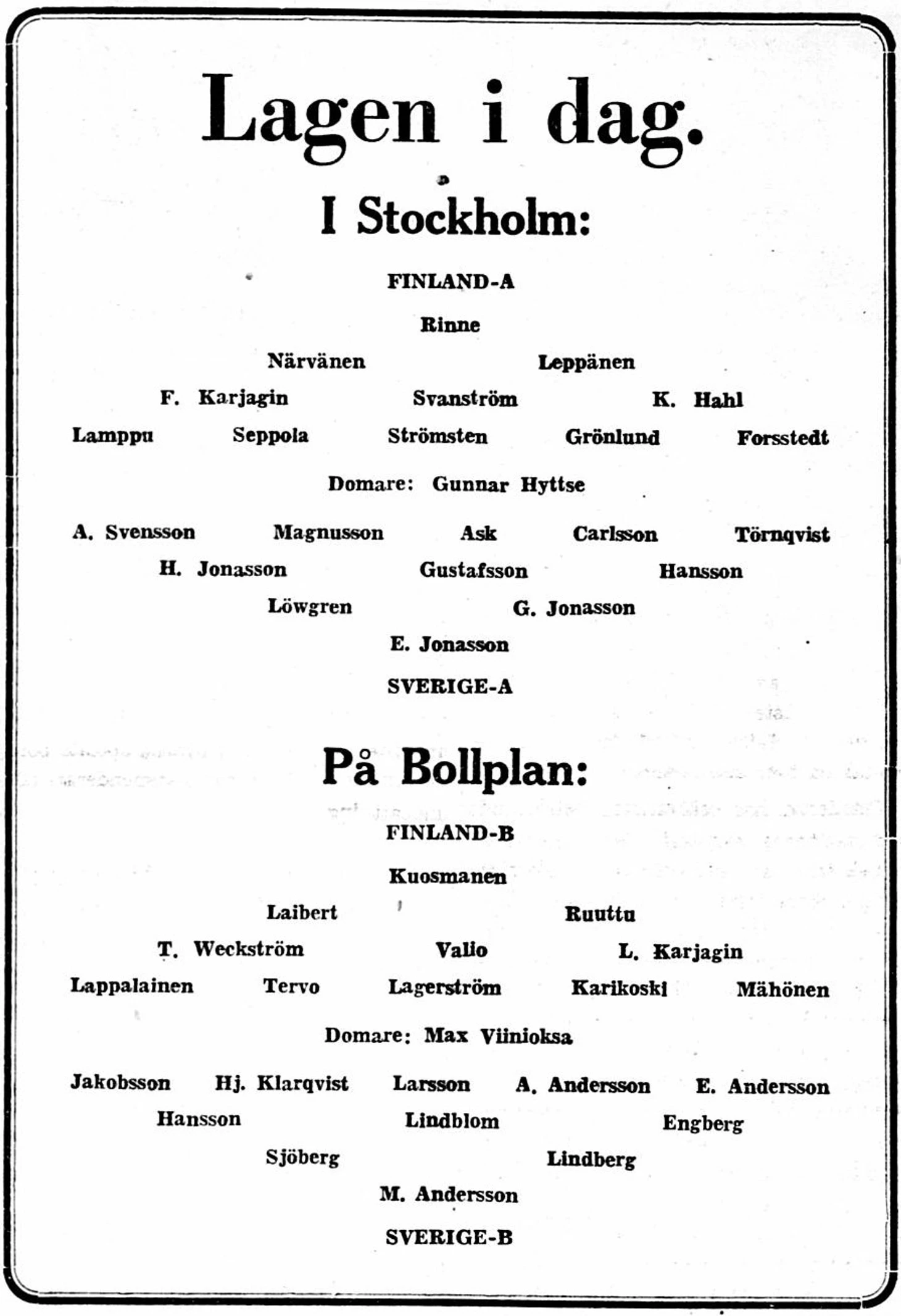 «Вчера вечером были выбраны игроки для участия в воскресном матче по хоккею с мячом в Швеции. Состав национальной команды на игру будет определен утром перед матчем. Список игроков следующий: A. Lagerström (Sudet), P. Konttinen (Ilves), E. Åberg (IFK), R. Lindroos (VP 35), R. Rinne (HJK), S. Takala (Ilves), F. Karjagin (IFK), V. Markkanen (VP 35), L. Karjagin (IFK), A. Jussila (VP 35), O. Forstedt (IFK), S. Salo (Sudet), K. Seppola (HJK) и K. Hahl (Sudet). Первые четверо выезжают сегодня, остальные - завтра, все на самолете. Председатель отборочной комиссии К. Алакари будет выступать в качестве сопровождающего» (газета «Або ундерряттелсэр» от 7 марта 1941 года)