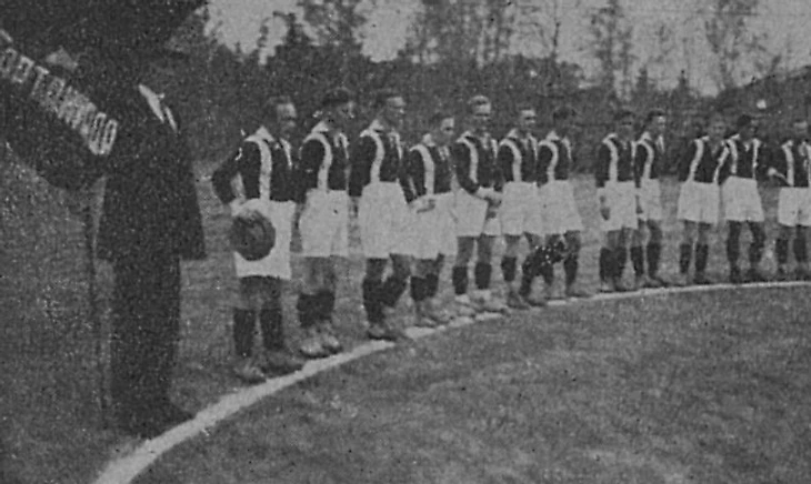 10 августа 1928 года. Хельсинки. Стадион «Тёёлён Паллокенття». Подготовка к Спартакиаде КСИ. Финляндия (TUL) - Ленинград - 2:4 (1:2). Совместное фото (хозяева в комбинированной форме) в перерыве (журнал «Тюёвяен урхейлулехти» № 33 от 16 августа 1928 года)