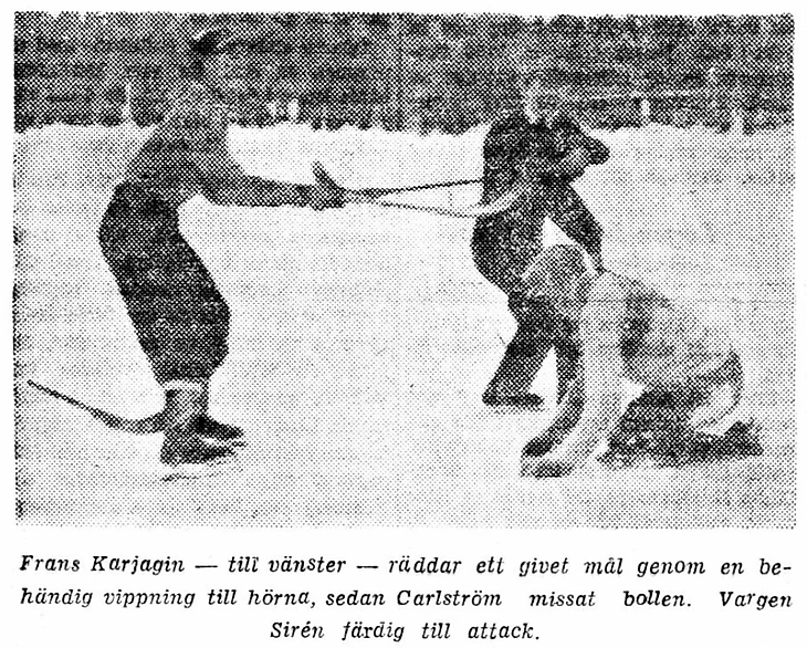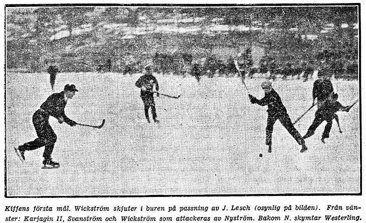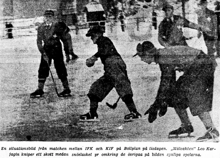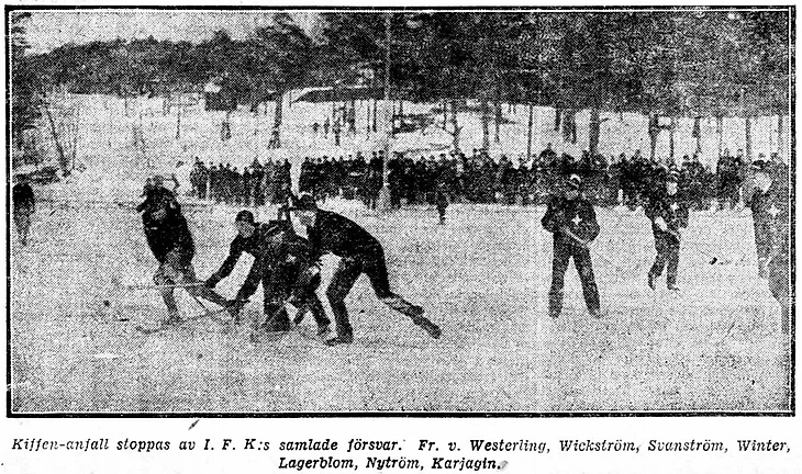 24 февраля 1929 года. Хельсинки. Стадион «Тёёлён Паллокенття». Полуфинал чемпионата SVUL по хоккею с мячом. Дополнительный матч. ХИФК - КИФ - 4:1. «Атака КИФа остановлена ХИФКом (слева направо): Вестерлинг (Westerling); Викстрём (Vickström), Сванстрём (Svanström), Винтер (Winter), Лагерблом (Lagerblom), Нюстрём (Nytröm), Ф. Карягин (Karjagin)». Фото из газеты «Хювюдстадсбладет» от 25 февраля 1929 года