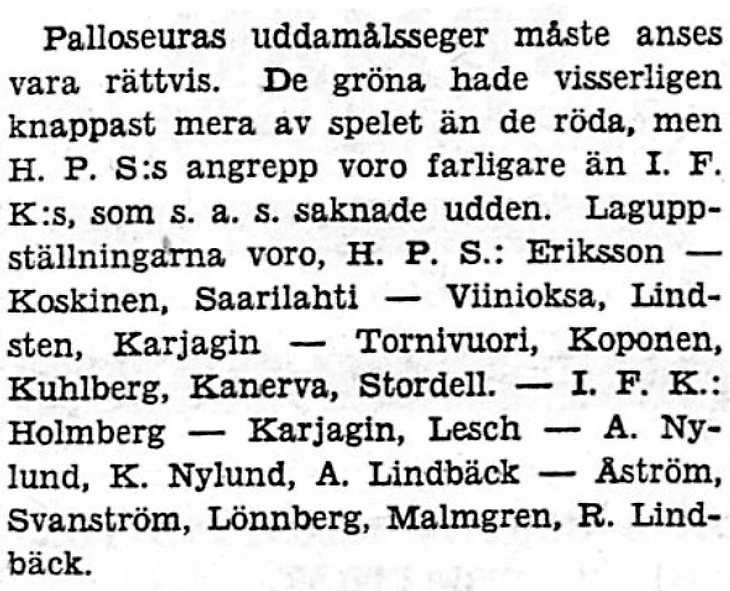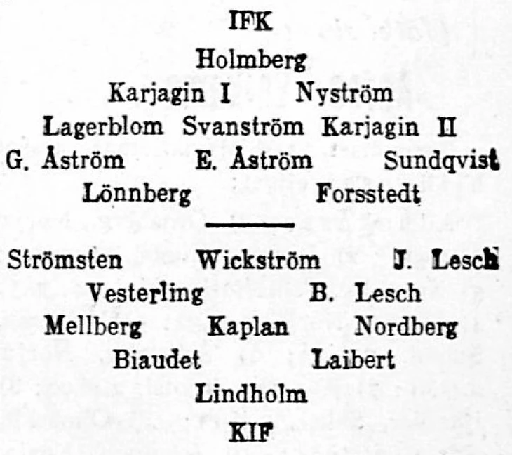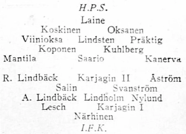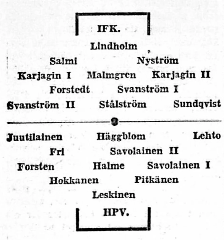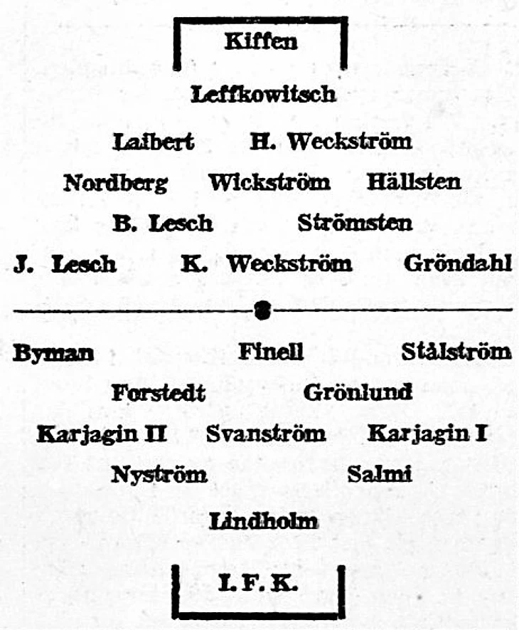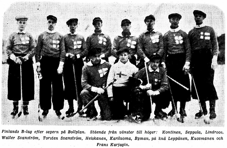 24 февраля 1929 года. Хельсинки. Стадион «Тёёлён Паллокенття». Полуфинал чемпионата SVUL по хоккею с мячом. Дополнительный матч. ХИФК - КИФ - 4:1. Ориентировочные состав команд из газеты «Хювюдстадсбладет» от 24 февраля 1929 года