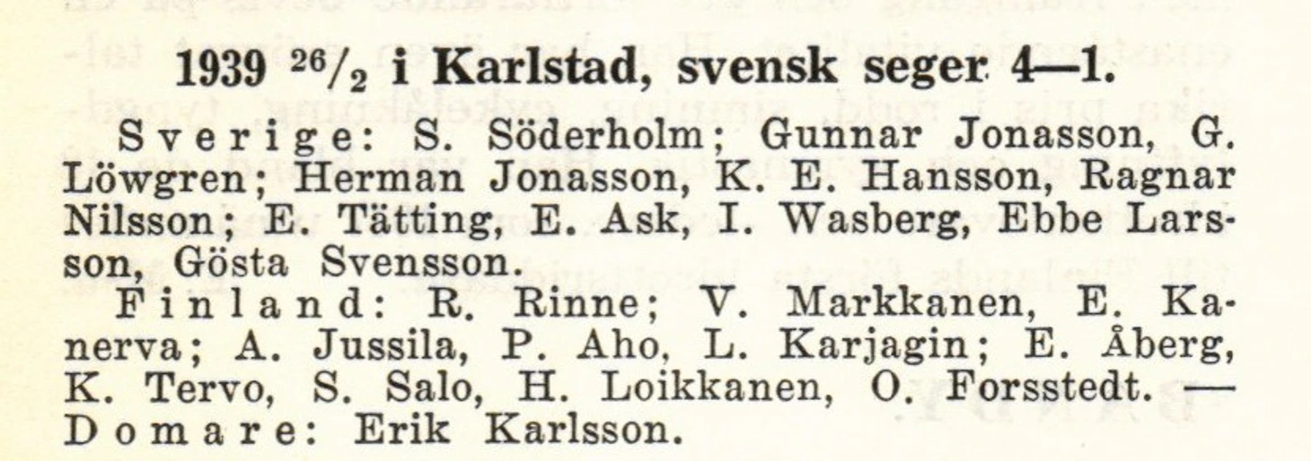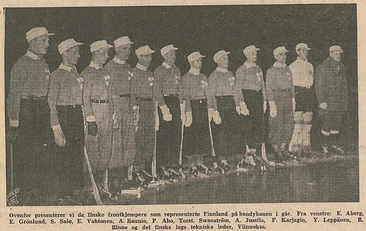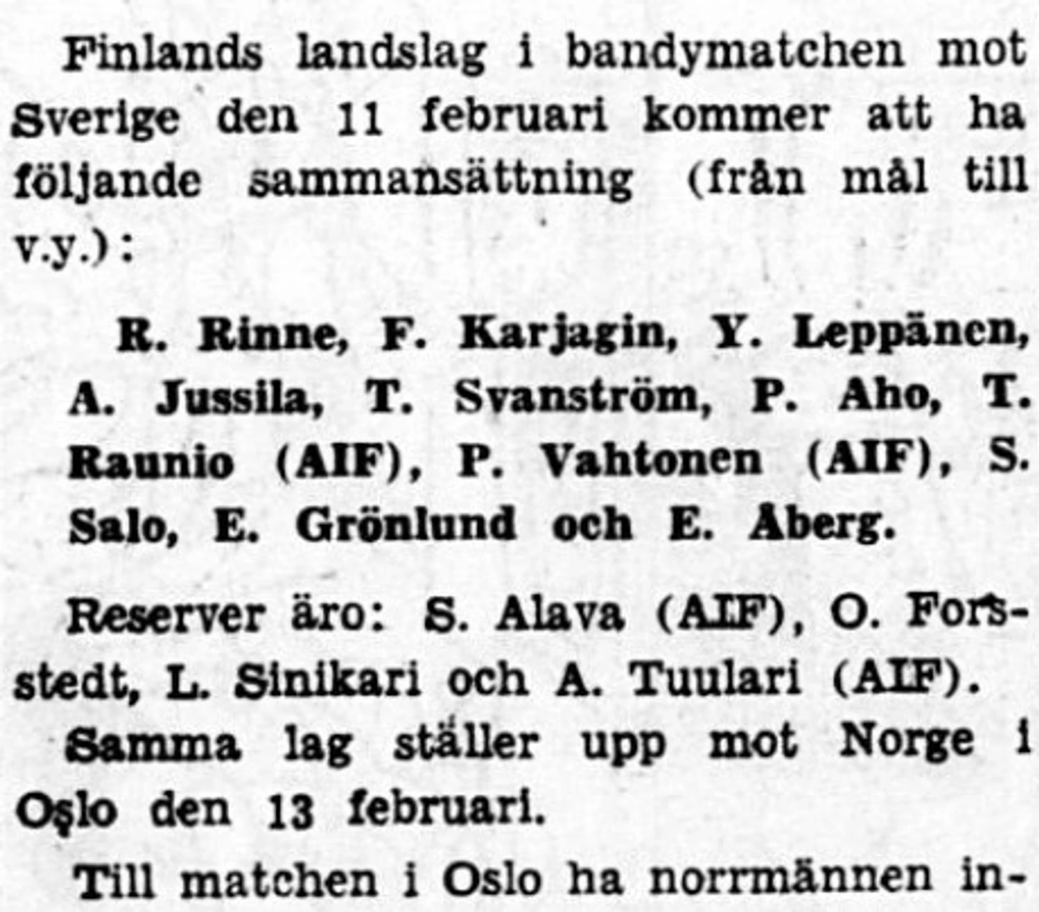 «Сформирована команда для матча со Швецией. Два игрока из TUL, остальные из SPL. Сборная Финляндии в матче по хоккею с мячом против Швеции 11 февраля будет иметь следующий состав (от вратаря до левого вингера): Р. Ринне, Ф. Карягин, Ю. Леппянен, А. Юссила, Т. Сванстрём, П. Ахо, Т. Раннио (TUL), П. Вахтонен (TUL), С. Сало, Э. Грёнлунд и Э. Оберг. Резервисты: С. Алава (TUL), О. Форстедт, Л. Синикари и А. Туулари (TUL). 13 февраля эта же команда в Осло встретится с первой сборной Норвегии» (газета «Хювюдстадсбладет» от 14 февраля 1940 года)