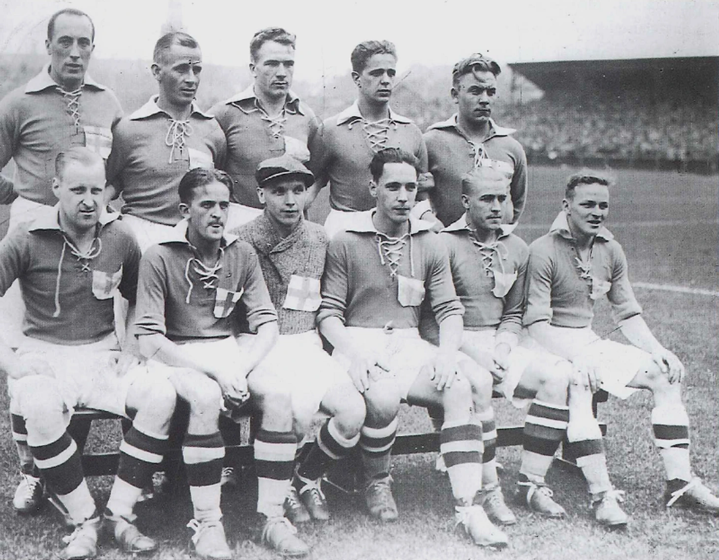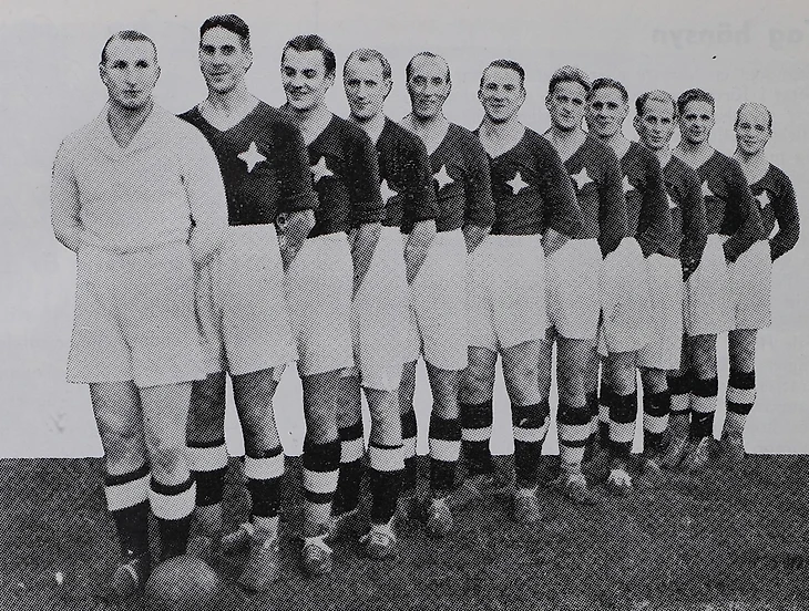 11 февраля 1940 года. Стокгольм. Олимпийский стадион. Сборная Финляндии перед товарищеским матчем со сборной Швеции (1:2). Франс Карягин первый справа в нижнем ряду (fi.wikipedia.org)