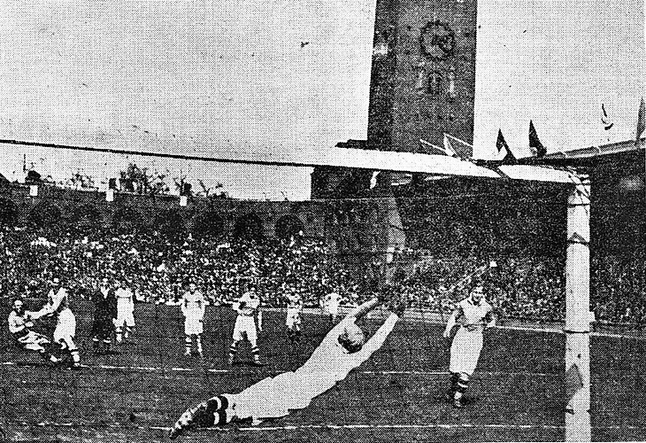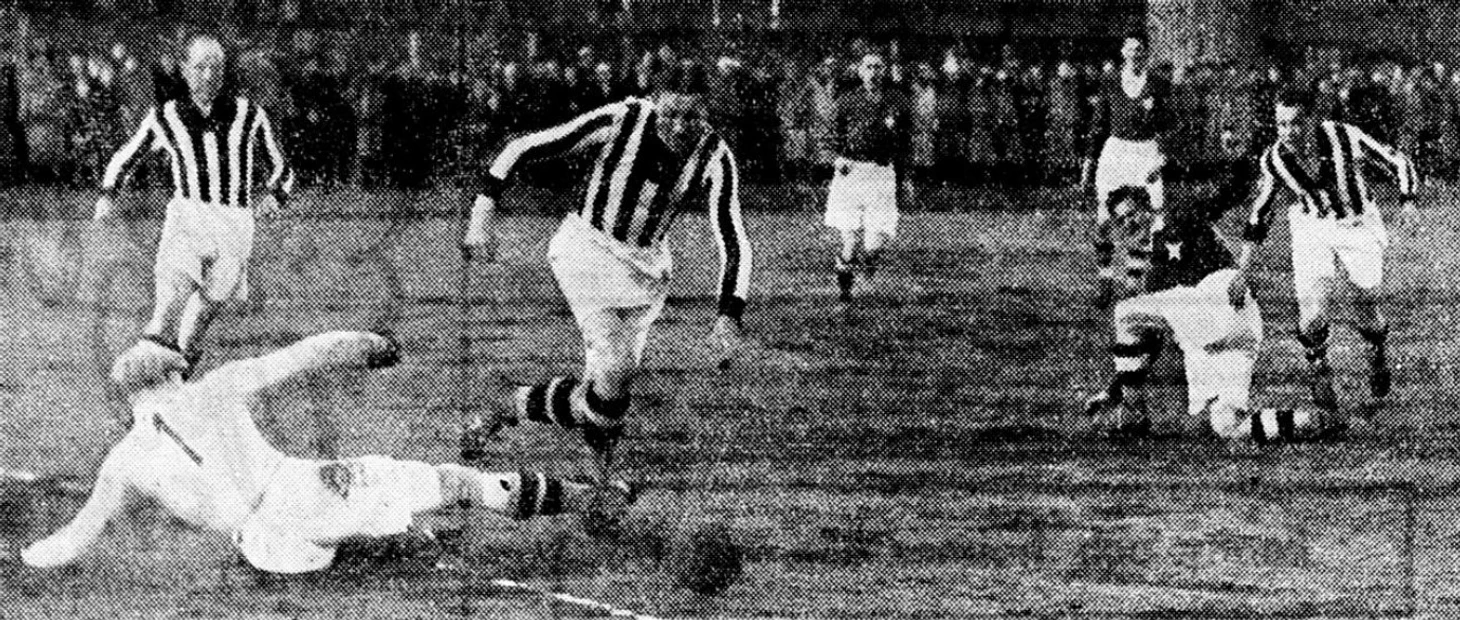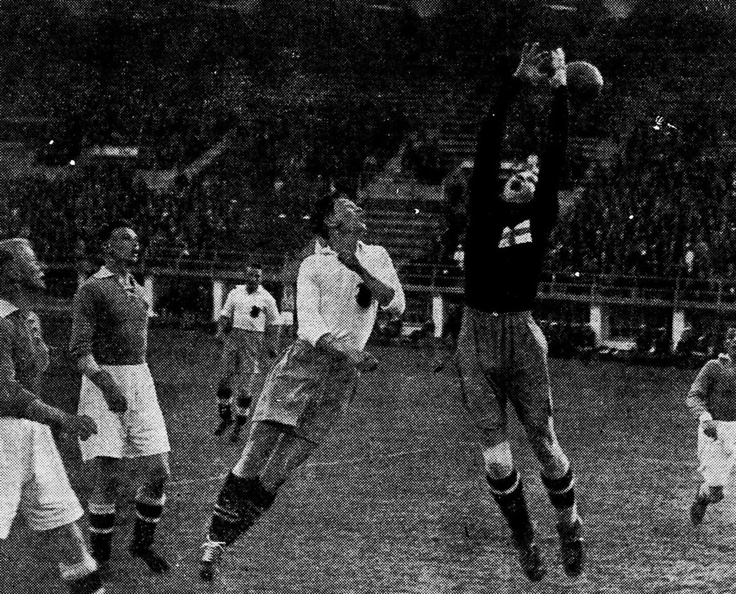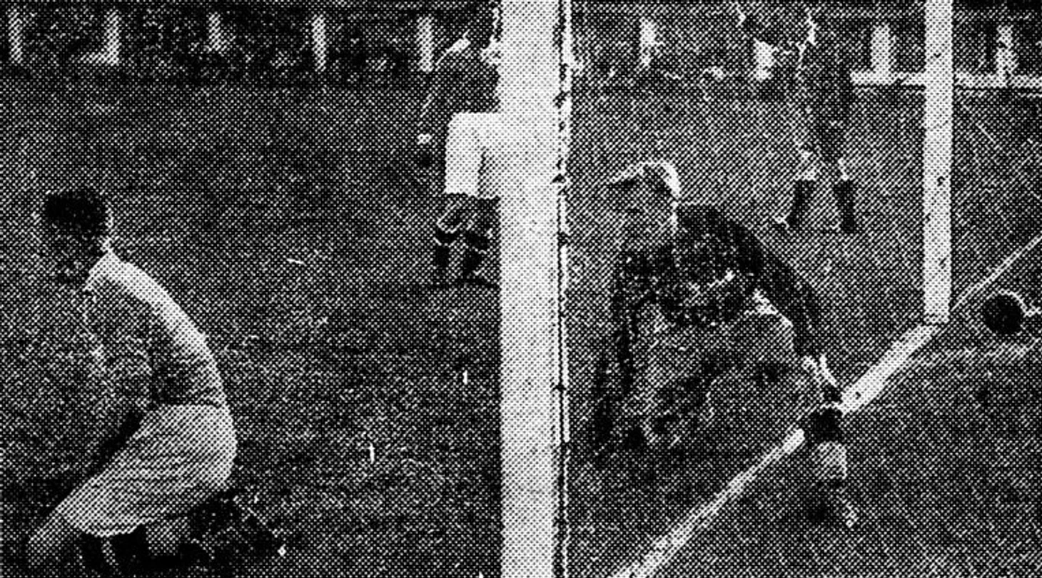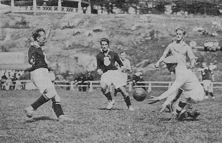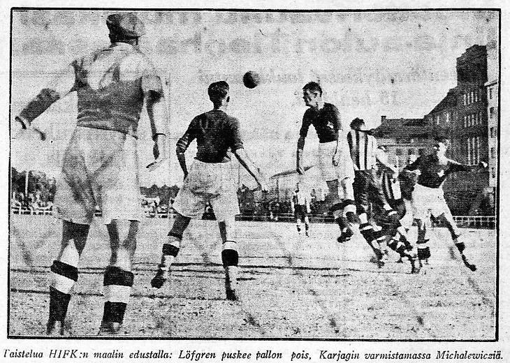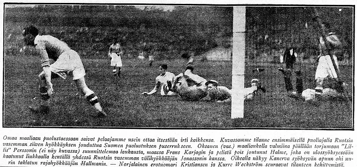 20 июля 1939 года. Хельсинки. Олимпийский стадион. Товарищеский матч. Финляндия - Италия - 2:3 (2:2). «Захватывающая ситуация перед воротами сборной Финляндии. Франс Карягин упал, Пю и Лескинен пытаются удержать «под контролем» знаменитого итальянца Пиолу, а великолепно проведший матч вратарь Сарнола (справа) спешит вмешаться» (газета «Уусимаа» от 21 июля 1939 года)