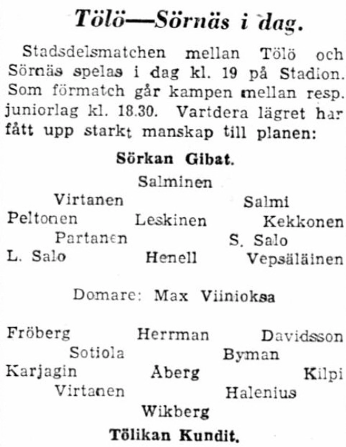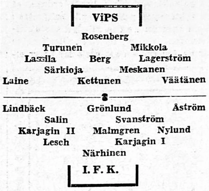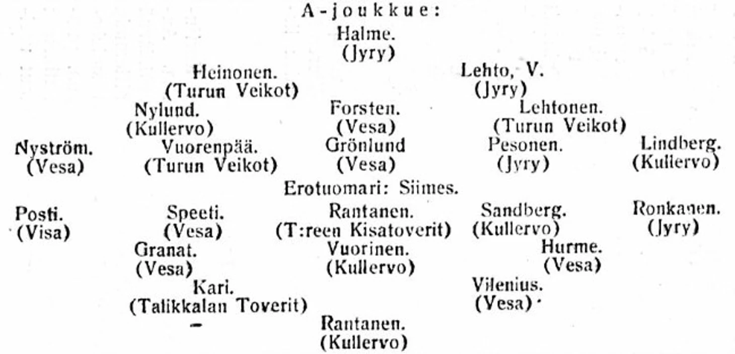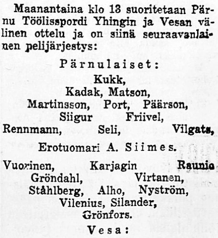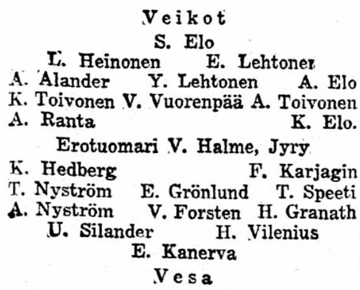 Анонс предстоящей 21 августа 1928 года (начало в 18:15) на стадионе «Тёёлён Паллокенття» футбольной игры чемпионата TUL «Веса» (Тёёлё, Хельсинки) - «Куллерво» (Хельсинки) с ориентировочными составами команд из газеты «Тюёвяеньярьестёен тиедонантая» от 20 августа 1928 года