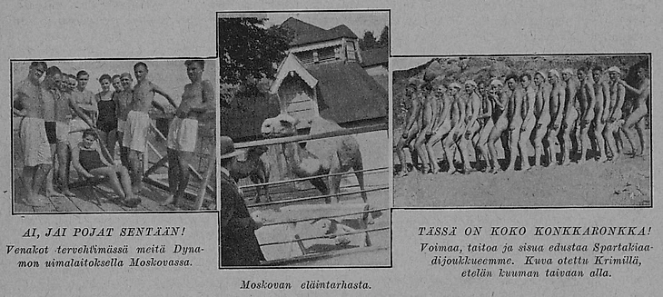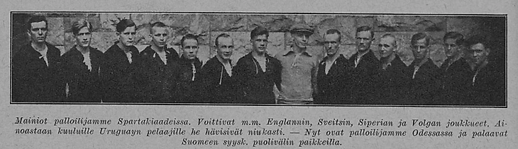 «Наши футболисты по-прежнему остаются в Советском Союзе. Они сыграют в Москве в следующее воскресенье. В предыдущем выпуске мы рассказывали, что наша спартакиадная футбольная команда вернется домой в ближайшие дни. Однако, мы получили письмо, из которого следует, что наши ребята все еще в Крыму и будут играть в ближайшее воскресенье в Москве. Поскольку есть вероятность, что они будут играть еще в и Ленинграде, похоже, что домой они приедут не раньше конца следующей недели» (журнал «Тюёвяен урхейлулехти» № 40 от 4 октября 1928 года).