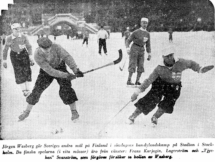 22 февраля 1942 года. Стокгольм. Товарищеский матч. Швеция - Финляндия - 8:0. «Йорген Васберг забивает второй гол сборной Швеции в ворота Финляндии в воскресном матче национальных сборных в Стокгольме. Финские игроки (слева направо в белых кепках): Франс Карягин, Лагерстрём и «Щукен» Сванстрём тщетно пытаются отобрать мяч у Васберга» (газета «Хювюдстадсбладет» за 25 февраля 1942 года)