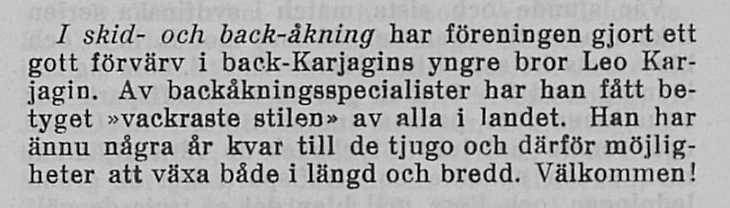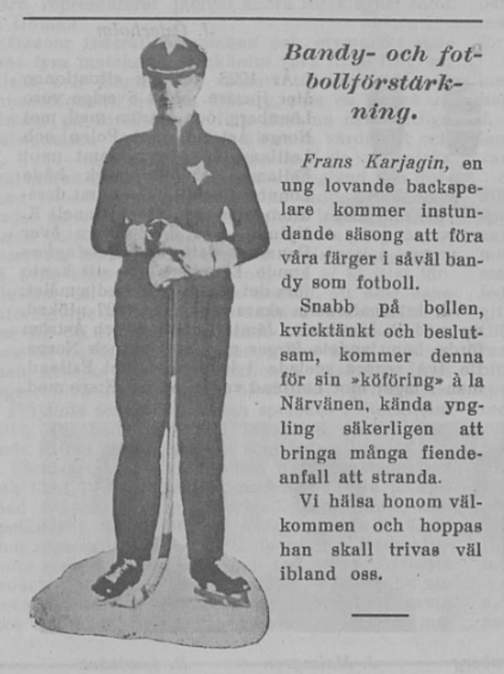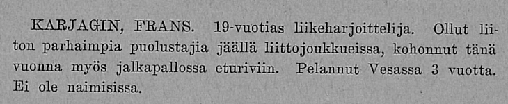 Декабрь 1928 года. Франс Карягин. ХИФК (Хельсинки). «Хоккейное и футбольное подкрепление. Франс Карягин - молодой и многообещающий защитник, в этом сезоне будет защищать наши цвета не только в футболе, но и в хоккее с мячом. Быстрый на мяче, сообразительный и решительный этот игрок приходит своеобразной «репликой» (копией) а-ля Нярвянен*, несомненно, он не позволит довести до конца многие атаки соперников. Мы приветствуем его и надеемся, что ему с нами будет хорошо» (клубное издание спортивной ассоциации «Камратерна в Хельсинки» (ХИФК) «Гельсингофорс камратен» № 10 за декабрь 1928 года)