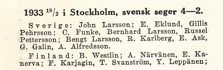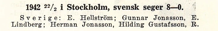 22 февраля 1942 года. Стокгольм. Товарищеский матч. Швеция - Финляндия - 8:0 (дополнительный том «Энциклопедии по спорту, гимнастике и жизни на природе», серия «Скандинавская семейная книга», Стокгольм, 1949 год)
