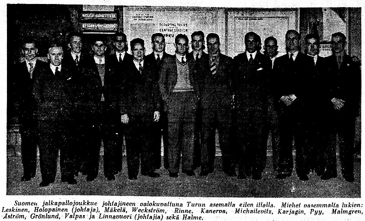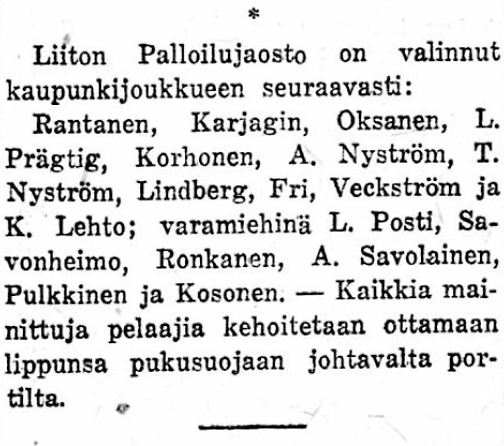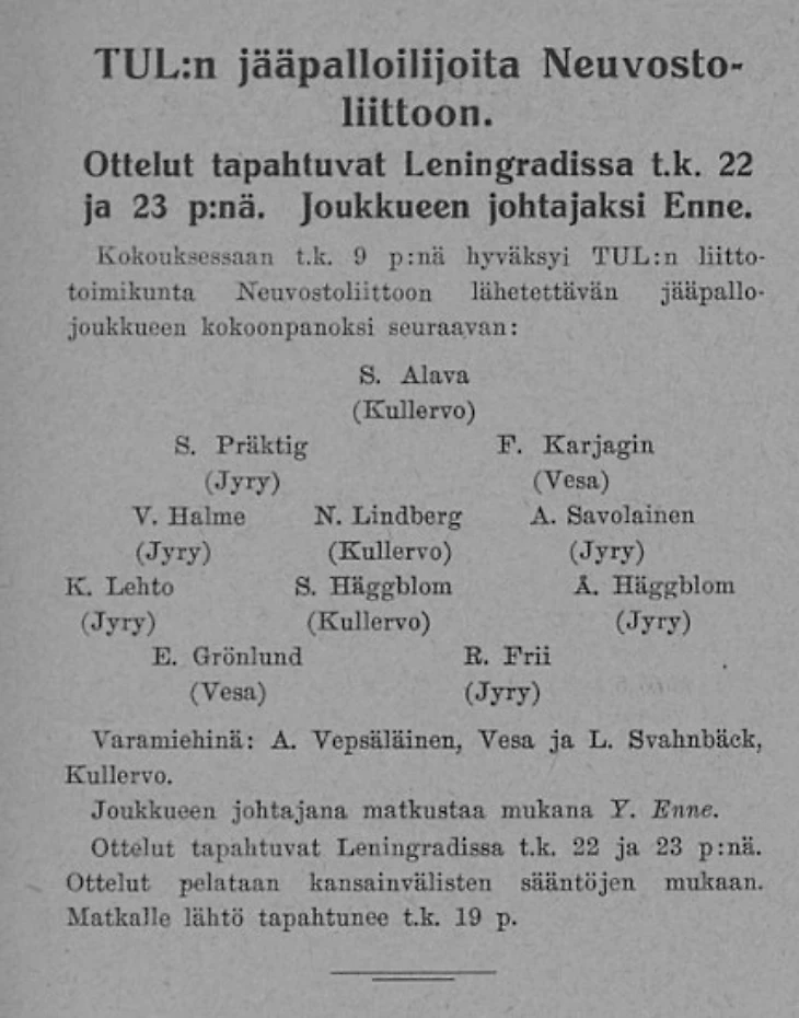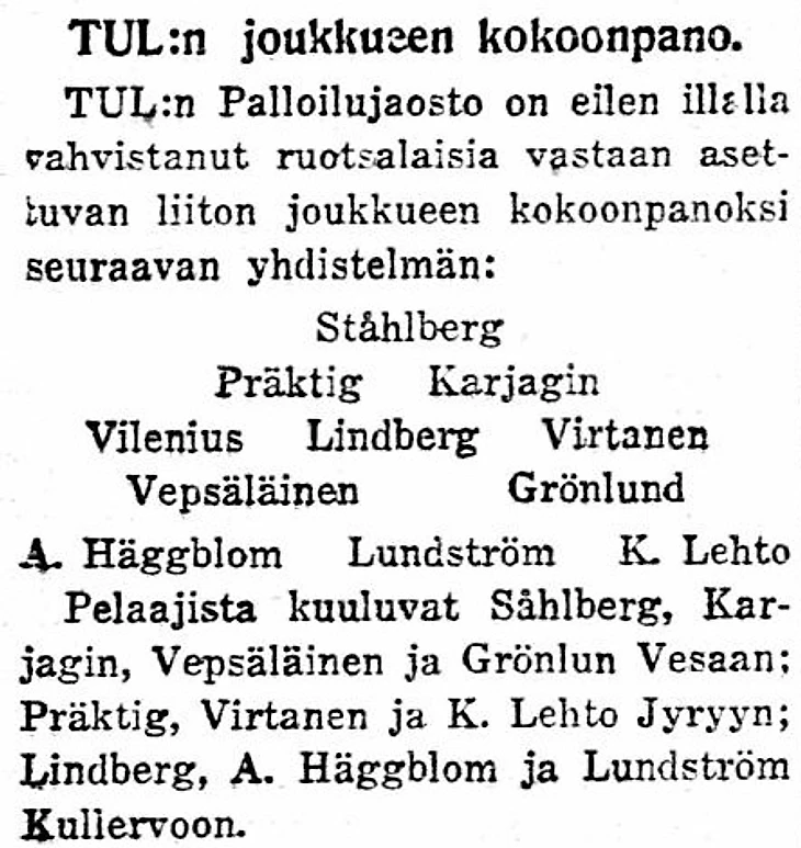 «Футболисты TUL в Россию. В следующую среду [20 июля 1927 года - примечание «ПСФ»] в 20 часов футбольная команда из 15 человек отправится в Россию, чтобы сыграть там четыре матча [по два в Москве и Свердловске - примечание «ПСФ»]. Команда состоит из следующих игроков: Вуоренпяя (Vuorenpää), Лехтонен (Lehtonen), Эло (Elo) и Хейнонен (Heinonen) из «Турун Вейкот» (Турку), Рантанен (Rantanen) из «Тамперен Кисатоверит» (Тампере), Юутилайнен (Juutilainen), Лескинен (Leskinen) и Пректиг ( Präktig) из «Юрю» (Хельсинки), Спети (Speeti), Карягин (Karjagin), Хурме (Hurme) и Нюстрём (Nyström) из «Весы» (Хельсинки), Рантанен (Rantanen) из «Куллерво» (Хельсинки) и Оксанен (Oksanen) из «Визы» (Хельсинки). Командой руководит Т. Яннер (T. Jänner)» (газета «Суомен сосиалидемокраатти» от 16 июля 1927 года).