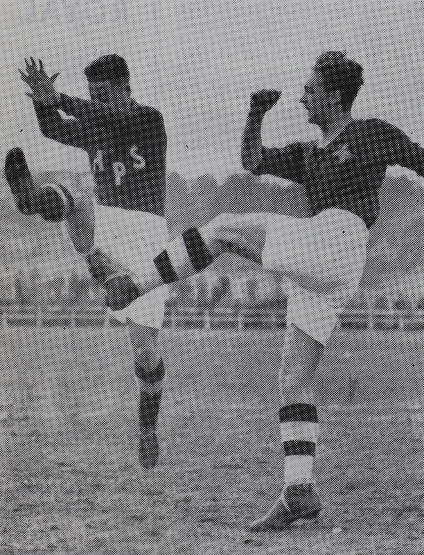11 мая 1941 года. Турку. Чемпионат SPL по футболу 1940/41. ТПС / «Турун Паллосеура» - ХИФК - 2:2. Франс Карягин (№ 2) и Аскен Оберг (слева) останавливают левого полусреднего ТПС Урхо Тераса (№ 10). Фото из газеты «Хювюдстадсбладет» за 2 апреля 1941 года