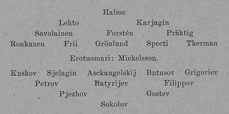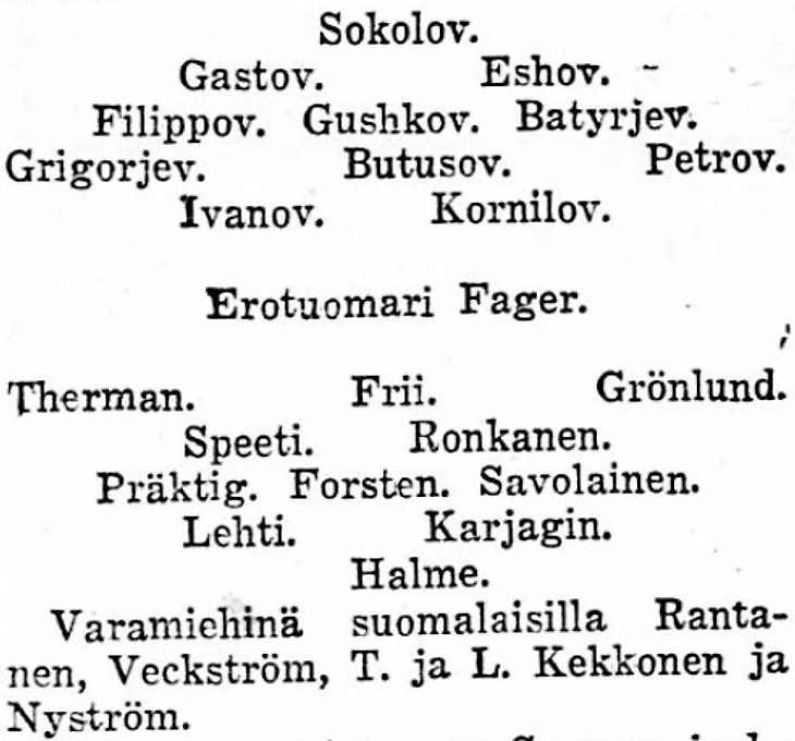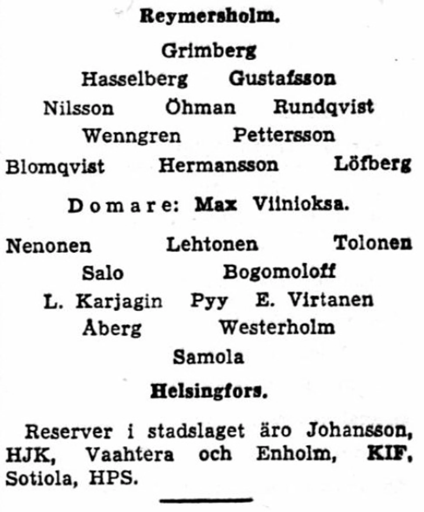 «Междугородний хоккейный матч Хельсинки - Тампере [в рамках II Фестиваля зимних видов спорта TUL - примечание «ПСФ»] будет сыгран в 11:30 на стадионе «Тёёлён Паллокенття». Сборная Хельсинки играет в следующем составе: С. Алава (S. Alava), Ф. Карягин (F. Karjagin), С. Пректиг (S. Präktig), О. Виитанен (O. Viitanen), Х. Вилениус (H. Vilenius), А. Парвиайнен (A. Parviainen), С. Хеггблем (S. Häggblom), Э. Грёнлунд (E. Grönlund), А. Саволайнен (A. Savolainen), О. Хеггблум (Ä. Häggblom) и С. Хаависто (S. Haavisto). Таким образом, состав команды сильно отличается от прошлого воскресного матча против Швеции. Наиболее заметным упущением является отстуствие Н. Линдберга. Это связано с тем, что он участвует в конькобежных соревнованиях» (газета «Тюёвяеньярьестёен тиедонантая» за 26 февраля 1927 года).