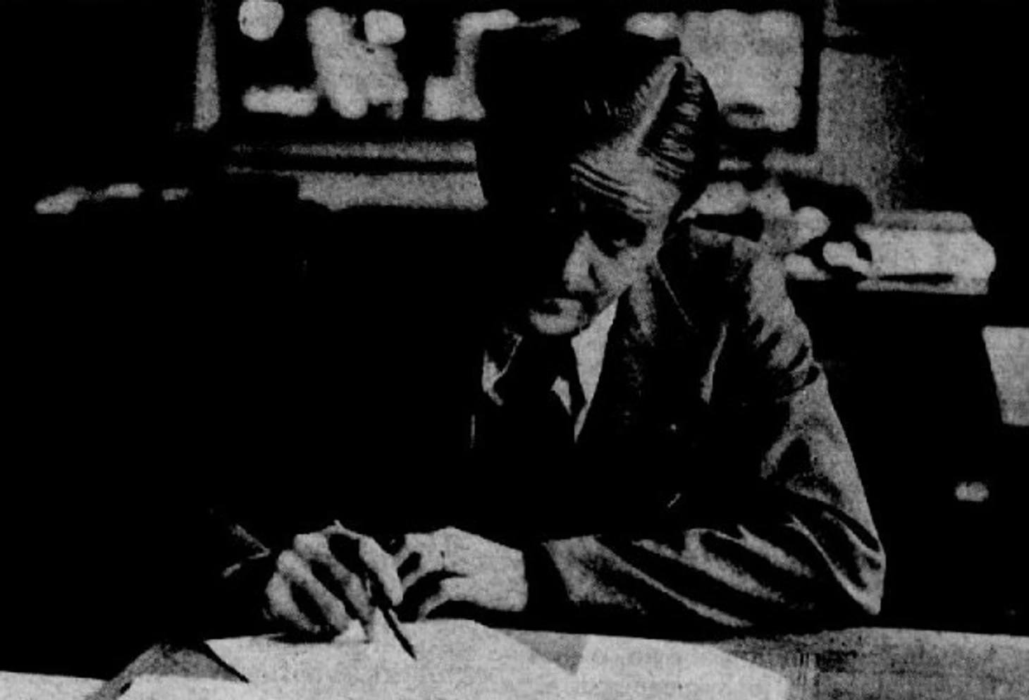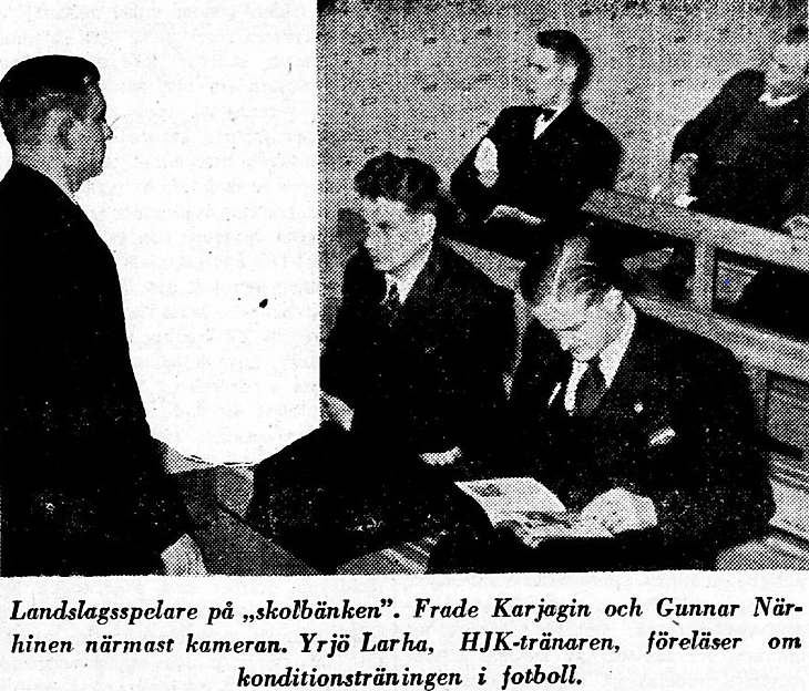 Весна 1941 года. «Игроки национальной команды на «школьной скамье». Ближе к камере Гуннар Няхинен и Фраде Карягин. Ирьё Ларха, тренер ХИКа, читает лекцию о кардиотренировках, которых нет ни у кого в футболе» (газета «Хювюдстадсбладет» за 2 апреля 1941 года)