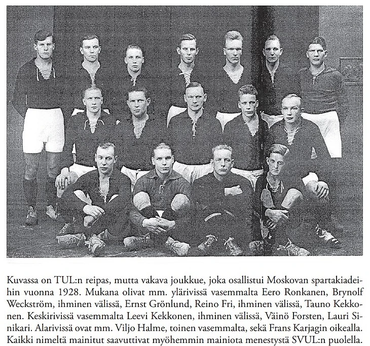 Август 1928 года. Хельсинки. Сборная Финляндия TUL. «Сильная команда Финляндии, занявшая третье место в упорных поединках Спартакиады» (слева направо): Векстрём (Veckström), Л. Кекконен (L. Kekkonen), Ронканен (Ronkanen), Пректиг (Präktig), Спети (Speeti), Терман (Therman), Т. Кекконен (T. Kekkonen), Халме (Halme), Фрии (Frii), Форстен (Forsten), Нюстрём (Nyström), Грёнлунд (Grönlund), Ф. Карягин (Karjagin) и Саволайнен (Savolainen). Фото из из газеты «Тюёвяеньярьестёен тиедонантая» от 10 августв 1928 года и еженедельного журнал «Тюёвяен урхейлулехти» № 37-38 от 13 сентября1928 года