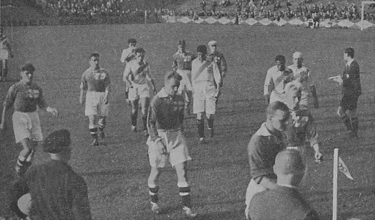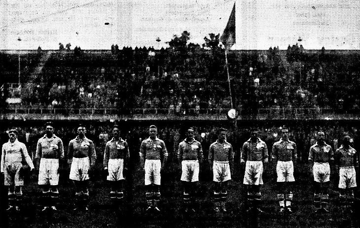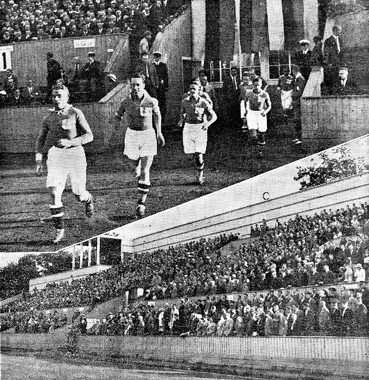13 февраля 1940 года. Осло. Стадион «Бислет». Сборная Финляндии перед товарищеским матчем со сборной Норвегии (2:1). Франс Карягин четвертый справа (газет «Арбайдербладет» (Осло) за 14 февраля 1940 года)