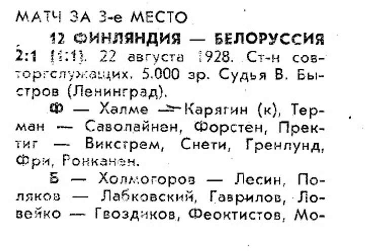 22 августа 1928 года. Спартакиада КСИ. Первенство сборных союзных республик. Матч за 3-е место. Финляндия - Белоруссия - 2:1 (Шваб П.Г. «Энциклопедия советского футбола», Черновцы, 1994 год)