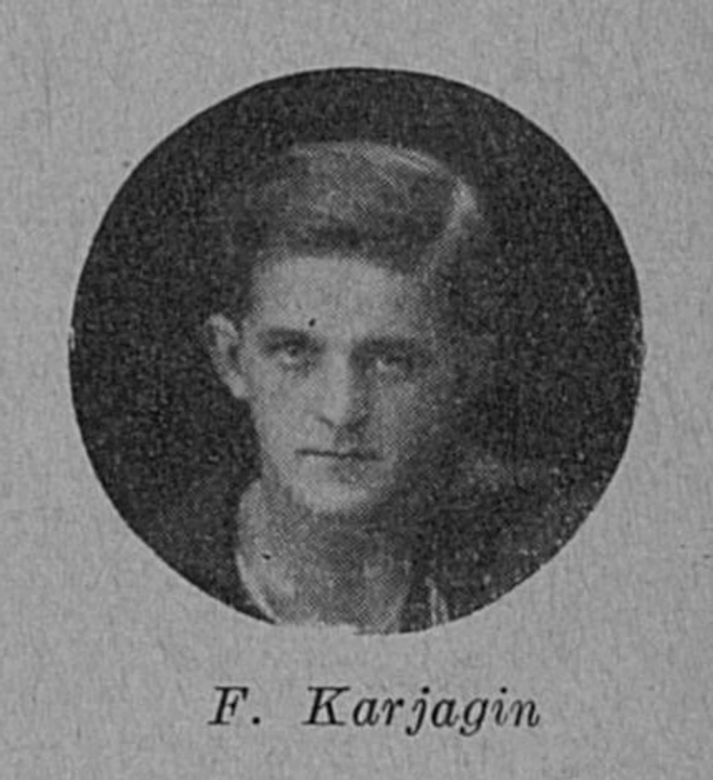 Январь 1928 года. Хоккейная сборная Финляндии Рабочего спортивного союза (TUL) перед своей первой международной поездкой. Она готвится к играм «с русскими» в Ленинграде, где 22 и 23 января состоялись две встречи с «Красным путиловцем» и сборной города. Франс Карягин первый слева в первом ряду (журнал «Тюёвяен урхейлулехти» № 3 от 19 января 1928 года)