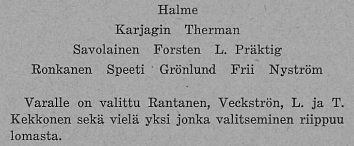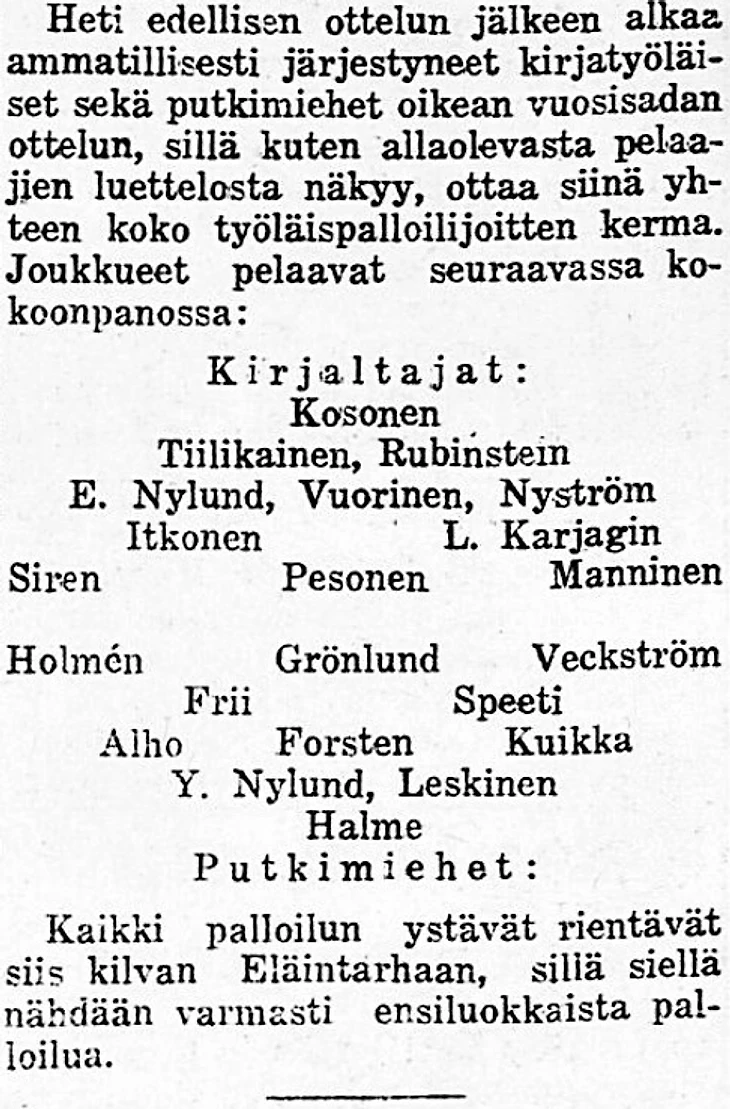 «Вечером 10 августа мы, финские рабочие спортсмены, поездом выехали из Хельсинки в Советскую Россию. В том числе была футбольная команда, в которую входили следующие игроки: Грёнлунд (Grönlund), Фрии (Frii), Спети (Speeti), Т. Нюстрём (T. Nyström), Ронканен (Ronkanen), Л. Пректиг (L. Präktig), Форстен (Forsten), А. Саволайнен (A. Savolainen), Терман (Therman), Карягин (Karjagin), Халме (Halme), Векстрём (Veekström), А. Рантанен (A. Rantanen), а также Л. и Т. Кекконены (L. и T. Kekkonen). Таким образом, за исключением пары человек, которые не могли отправиться в поездку из-за препятствий на работе, команда была лучшей рабочей футбольной командой в Финляндии» (журнал «Тюёвяен урхейлулехти» № 33 от 16 августа 1928 года).