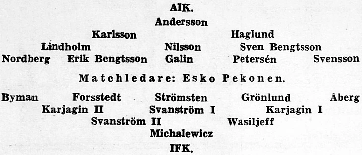 20 августа 1940 года. Товарищеский матч. ХИФК - ХИК. Ориентировочные составы команд из газеты «Хювюдстадсбладет» от 20 августа 1940 года